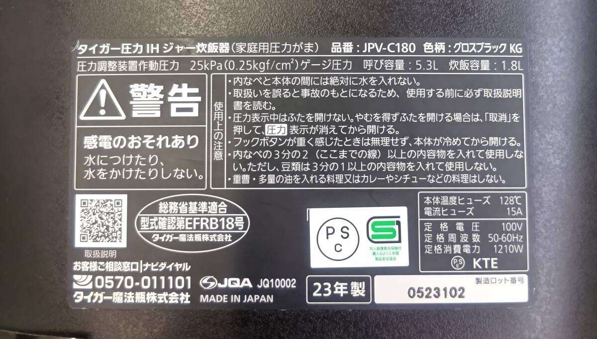 【6741】中古品 2023年製 タイガー JPV-C180 圧力IH炊飯器 10合炊き