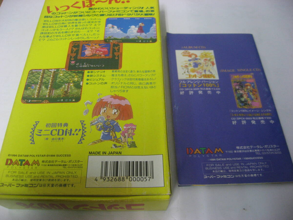 スーパーファミコン用コットン100%中古です。付属品===箱・説・トレー・ハガキ。特典CD無。コンディションC(箱D)です。箱裏面下部セロテープ跡・側面価格シール跡有り。カセット左側面黄シミ有り(小程度)。説裏表紙ややスレ。クリーニング・除菌・動作チェック済みです。入札に前向きな方は必ず自己紹介文をご覧いただき内容にご同意頂いた上でご入札お願いいたします。ご入札はご同意とみなします。