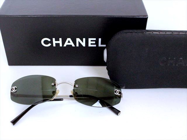 良品☆CHANEL【シャネル】サイドココマーク スクエア型サングラス☆ダークグリーンブラック系×シルバー金具☆上品☆レディース☆