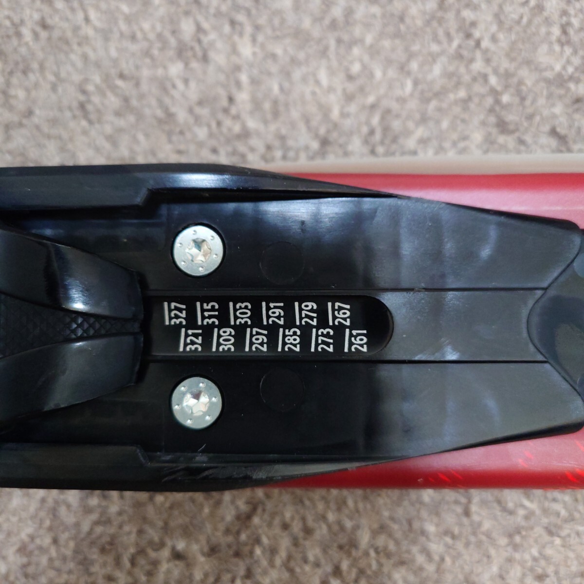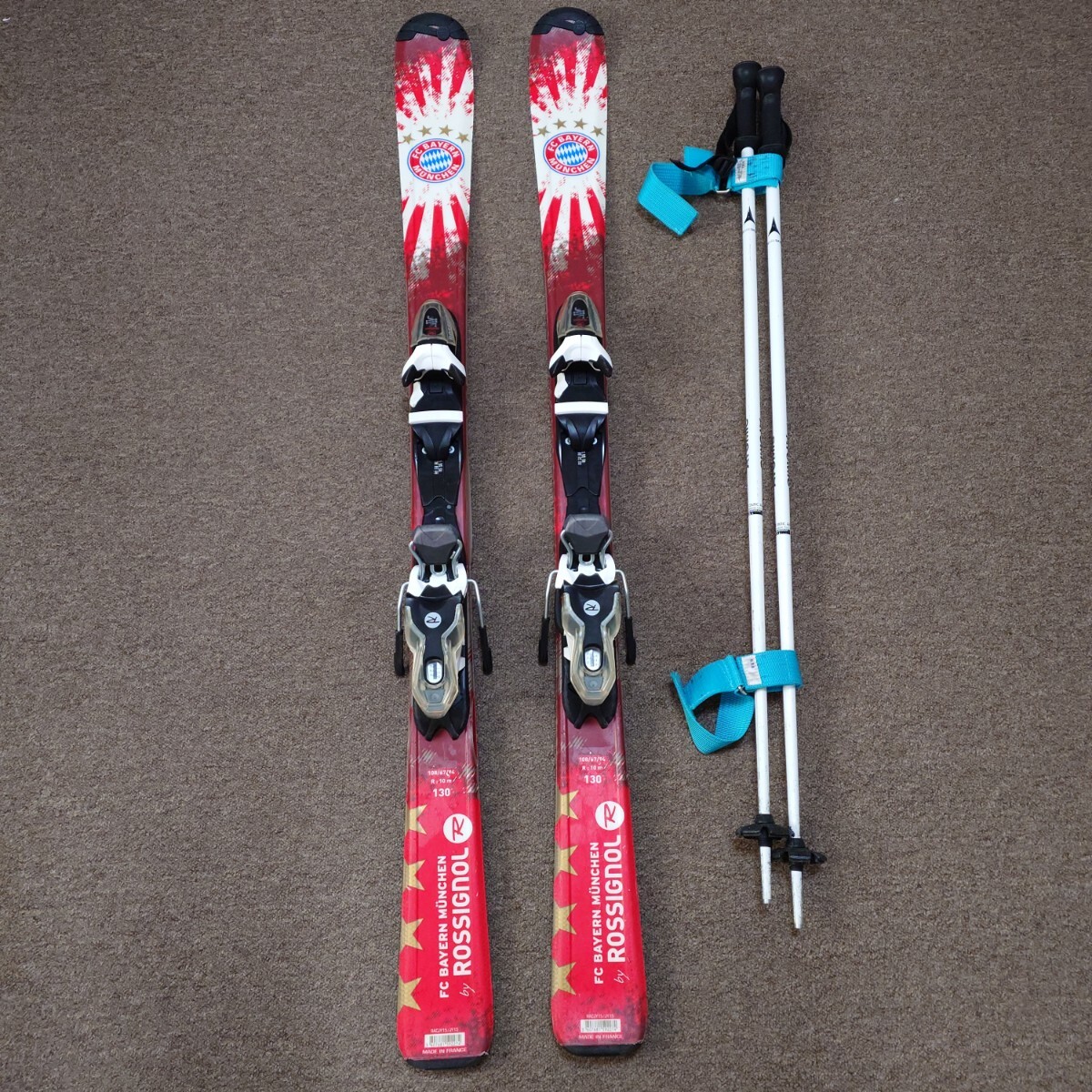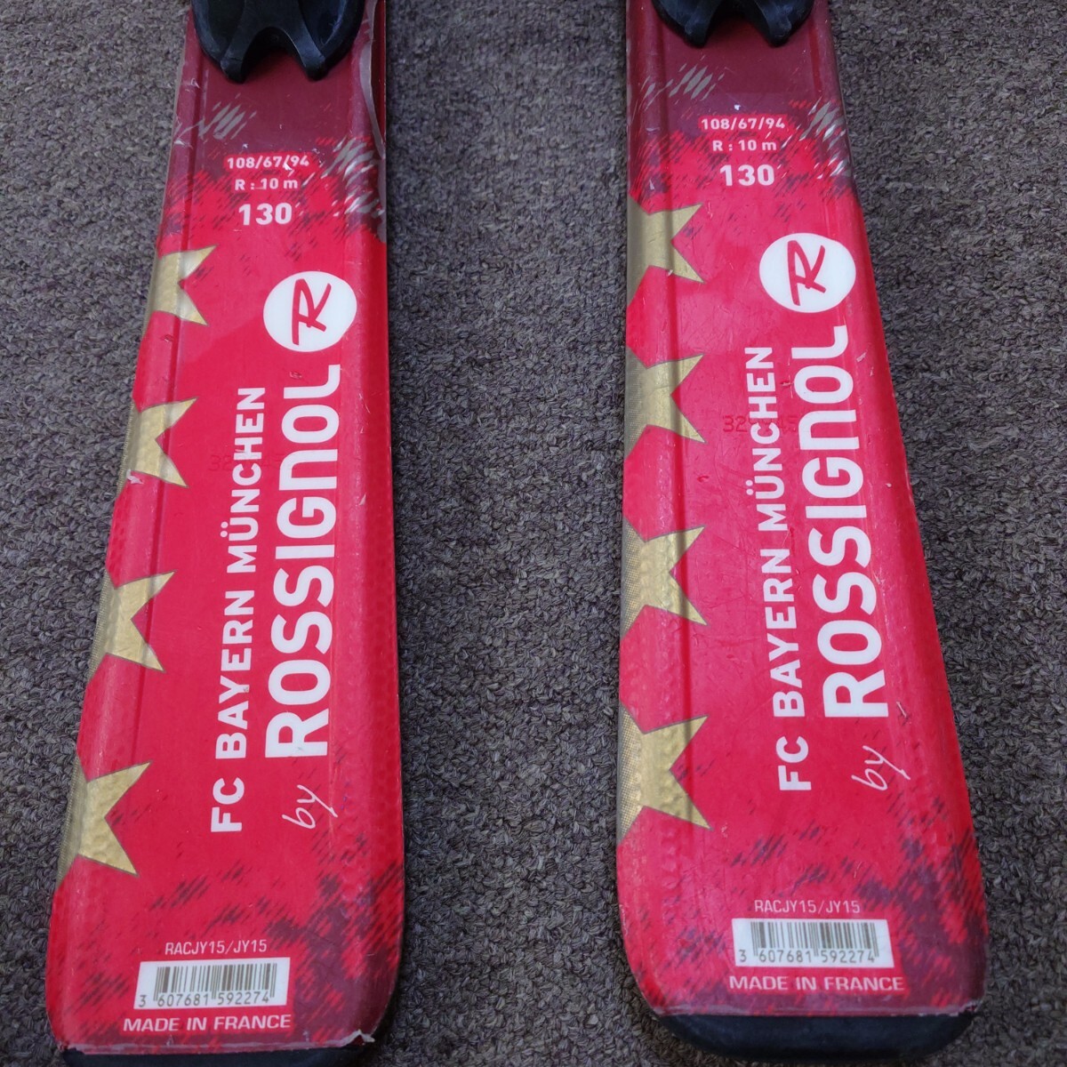 FCバイエルン・ミュンヘンデザインの130cmスキー板、ビンディング調整範囲261-327mm。