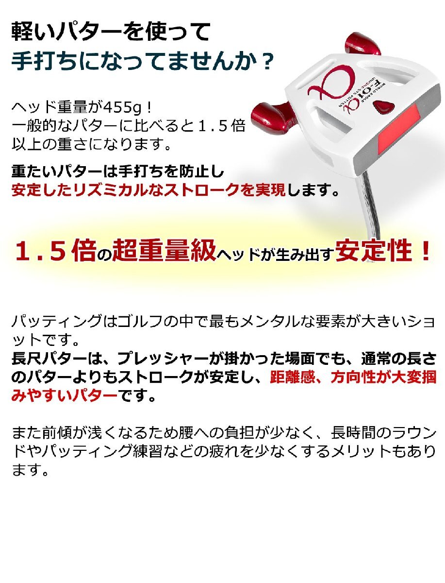 ヘッド重量が455g!一般的なパターに比べると1.5倍以上の重さになります。重たいパターは手打ちを防止し安定したリズミカルなストロークを実現します。ゴルフ初心者のお客様や、久しぶりにゴルフを再開させる方々向けにたくさんの「F-01」ブランド商品を作ってまいりました。その中で満を持して登場したのが、こちらのパターになります。ゴルフを楽しく簡単にプレイ出来るように様々な工夫をしております。必ずやご満足いただけると確信しております。