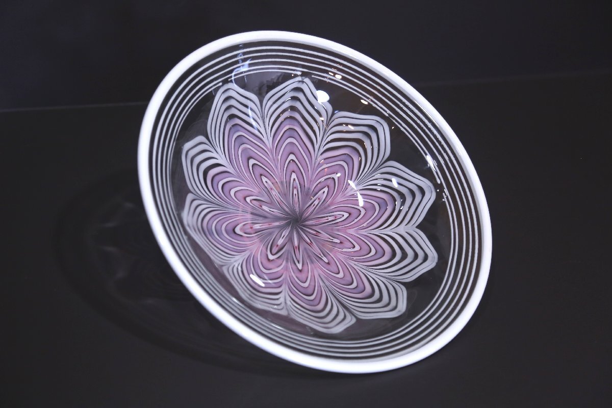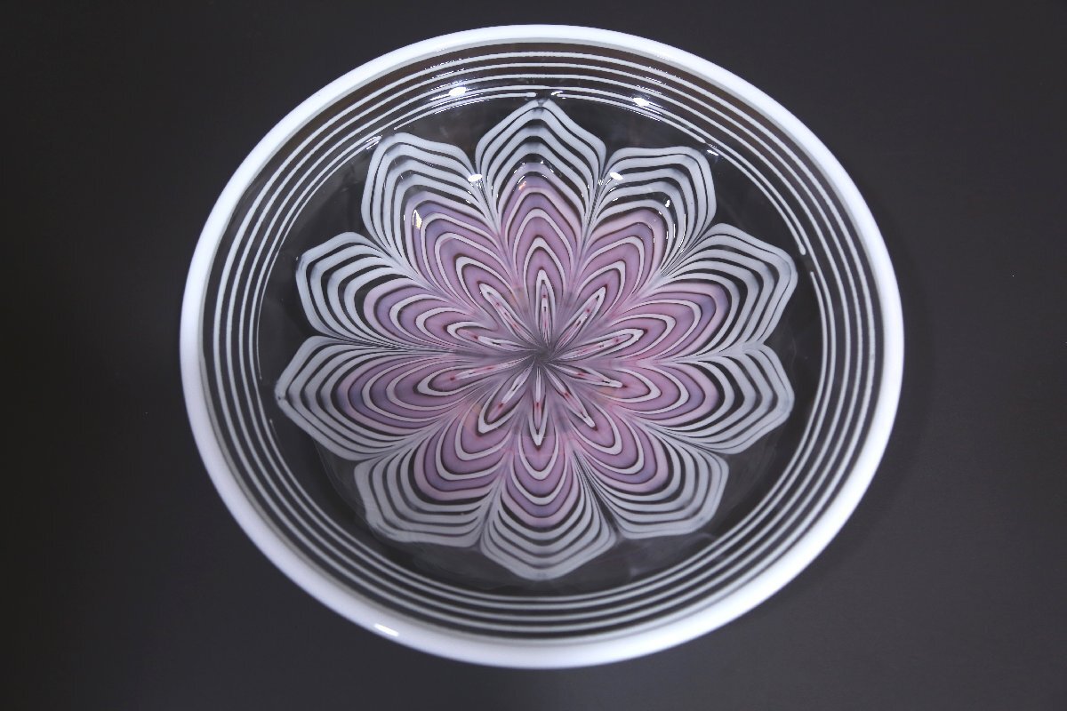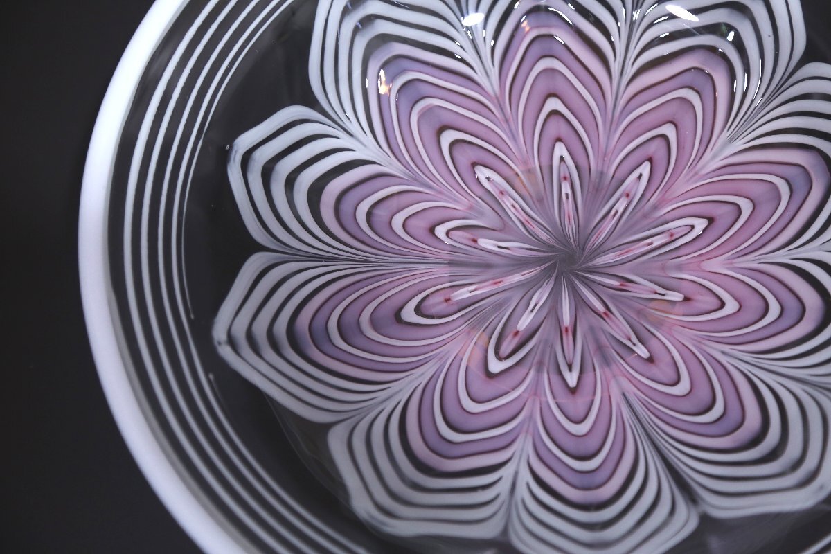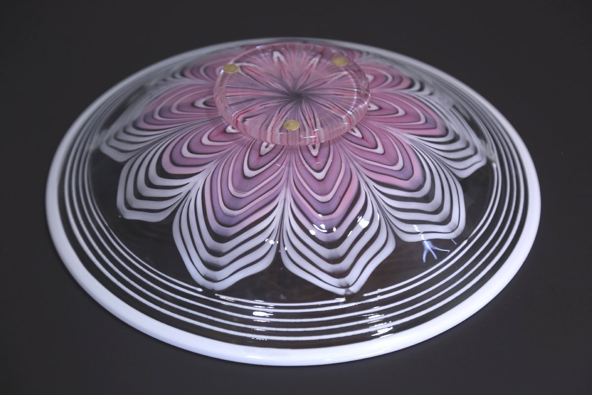 岩田久利(いわたひさとし):昭和元(1925)年12月18日、ガラス工芸家岩田藤七の長男として東京に生まれる。 東京美術学校工芸部図案科に学び、在学中の同24年第5回日展に「硝子ぶどうの鉢」で初入選し以後も日展に出品を続ける。同26年東京美術学校を卒業。制作のかたわら、東京工業大学でガラスの組成を研究する。同30年第11回日展に「藻」を出品して特選、同31年第12回同展には「萌生」を出品して二年連続特選となった。同30年より光風会にも出品。同33年日展会員となり、同年からたびたび日展審査員をもつとめる。同47年日本ガラス工芸会を設立し、同年より同52年までその初代会長をつとめる。同51年第8回改組日展に「孔雀文大皿」を出品して文部大臣賞を受賞。同57年毎日芸術賞を受賞し、同58年「聖華」で日本芸術院賞を受賞した。 父の創立になる岩田工芸硝子を継ぎ、社長をつとめつつ制作を続け、斬新で優美な作風を示した。宙吹きガラスを得意とし、国際的にも高い評価を得た。 墓所は、日蓮宗威光山法明寺 (豊島区)、戒名は、輝光院能持日久居士。綺麗で状態良好です。直径30.5cm、高さ7.5cm。ノークレーム、ノーリターンでお願い致します。この他にも出品しておりますのでご覧下さい。ここをクリック