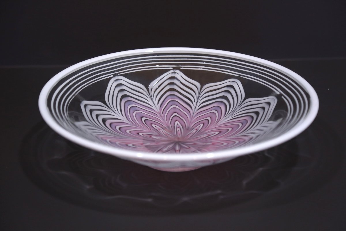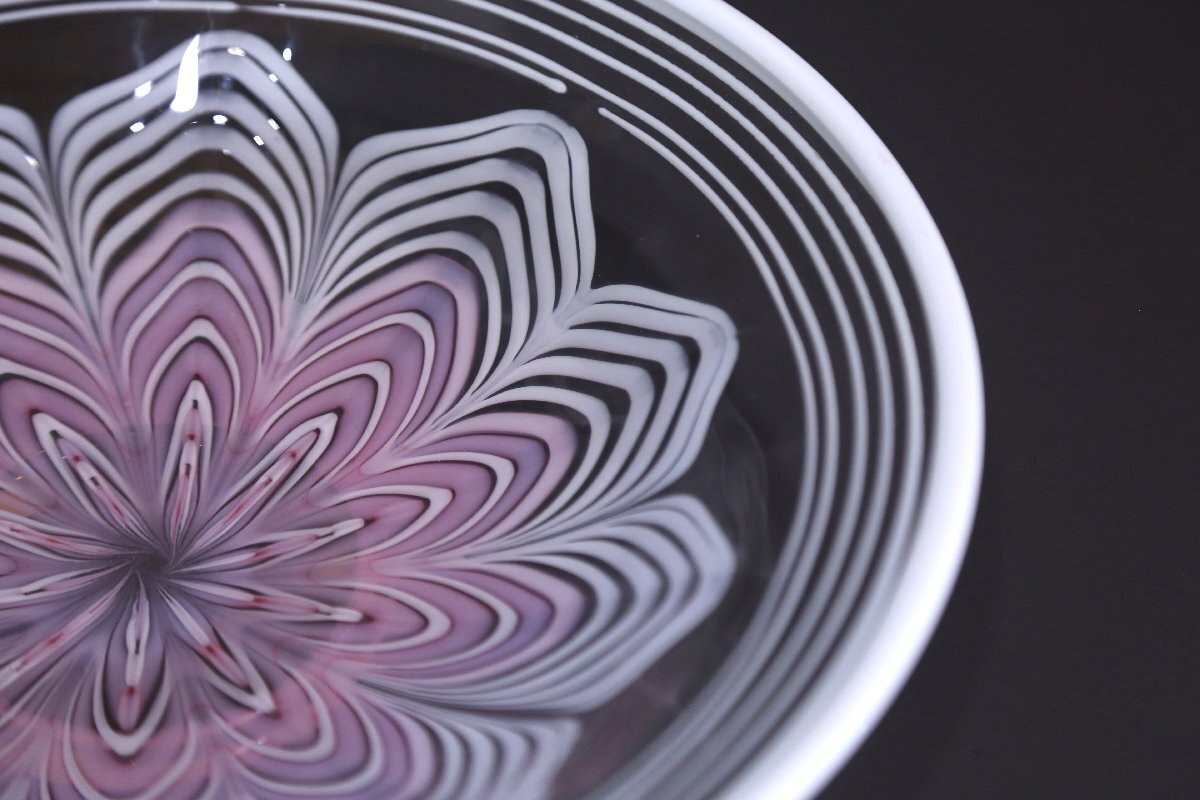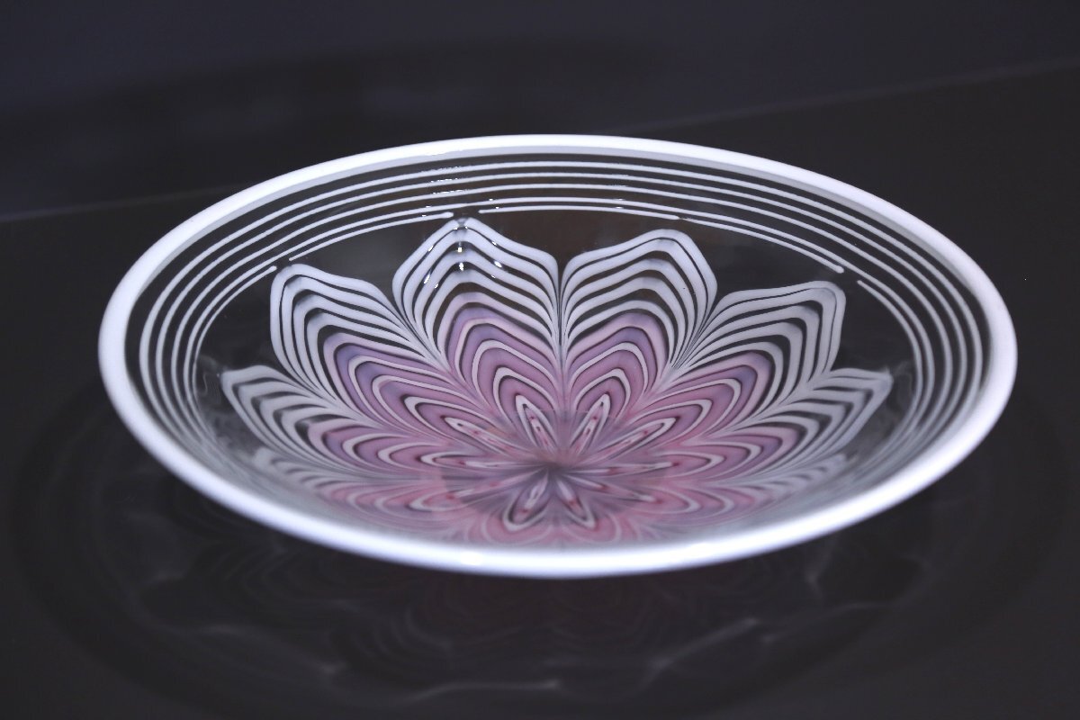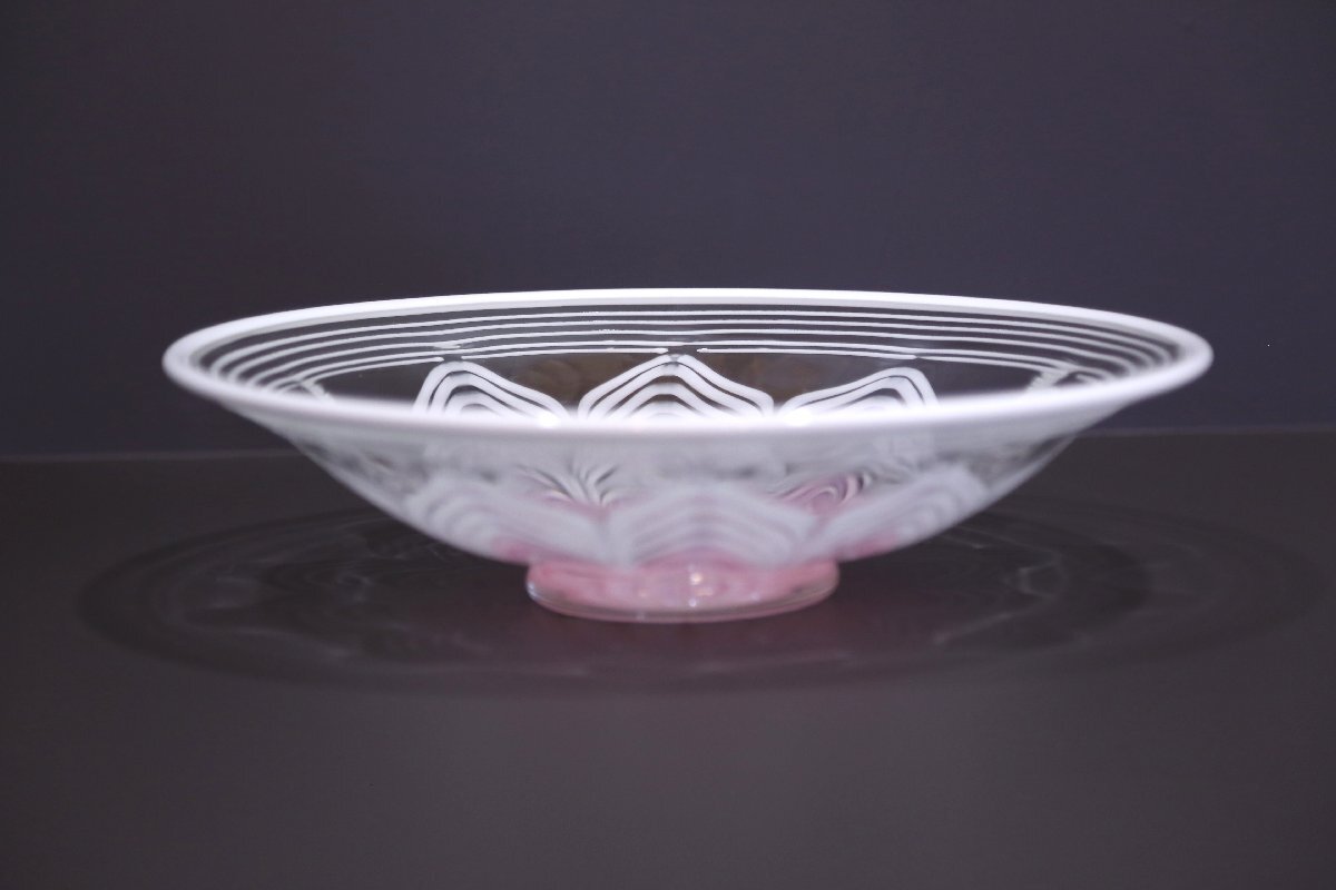 岩田久利(いわたひさとし):昭和元(1925)年12月18日、ガラス工芸家岩田藤七の長男として東京に生まれる。 東京美術学校工芸部図案科に学び、在学中の同24年第5回日展に「硝子ぶどうの鉢」で初入選し以後も日展に出品を続ける。同26年東京美術学校を卒業。制作のかたわら、東京工業大学でガラスの組成を研究する。同30年第11回日展に「藻」を出品して特選、同31年第12回同展には「萌生」を出品して二年連続特選となった。同30年より光風会にも出品。同33年日展会員となり、同年からたびたび日展審査員をもつとめる。同47年日本ガラス工芸会を設立し、同年より同52年までその初代会長をつとめる。同51年第8回改組日展に「孔雀文大皿」を出品して文部大臣賞を受賞。同57年毎日芸術賞を受賞し、同58年「聖華」で日本芸術院賞を受賞した。 父の創立になる岩田工芸硝子を継ぎ、社長をつとめつつ制作を続け、斬新で優美な作風を示した。宙吹きガラスを得意とし、国際的にも高い評価を得た。 墓所は、日蓮宗威光山法明寺 (豊島区)、戒名は、輝光院能持日久居士。綺麗で状態良好です。直径30.5cm、高さ7.5cm。ノークレーム、ノーリターンでお願い致します。この他にも出品しておりますのでご覧下さい。ここをクリック