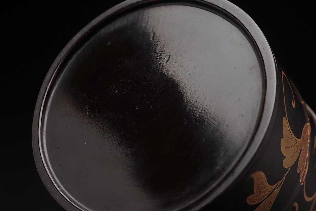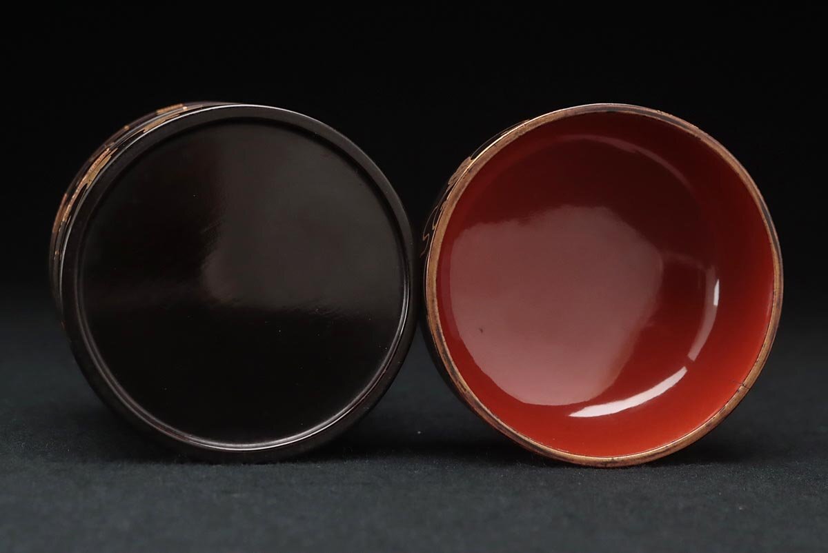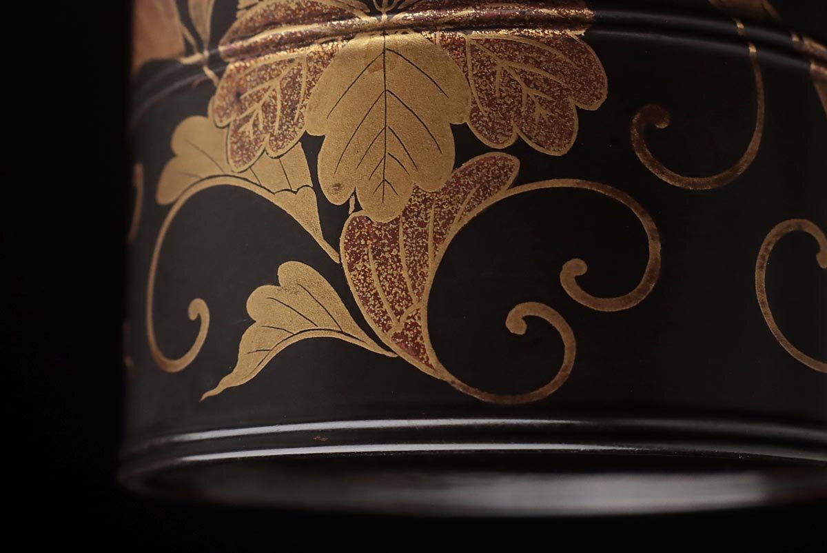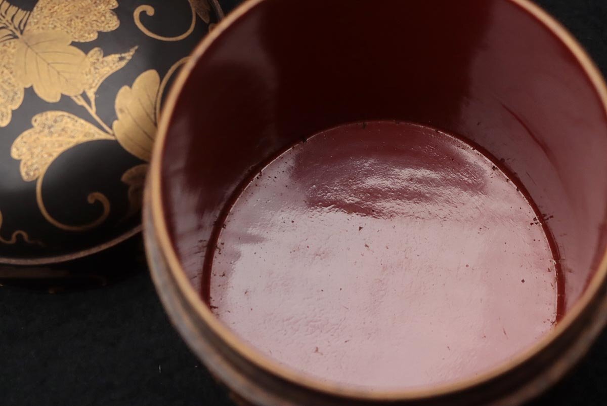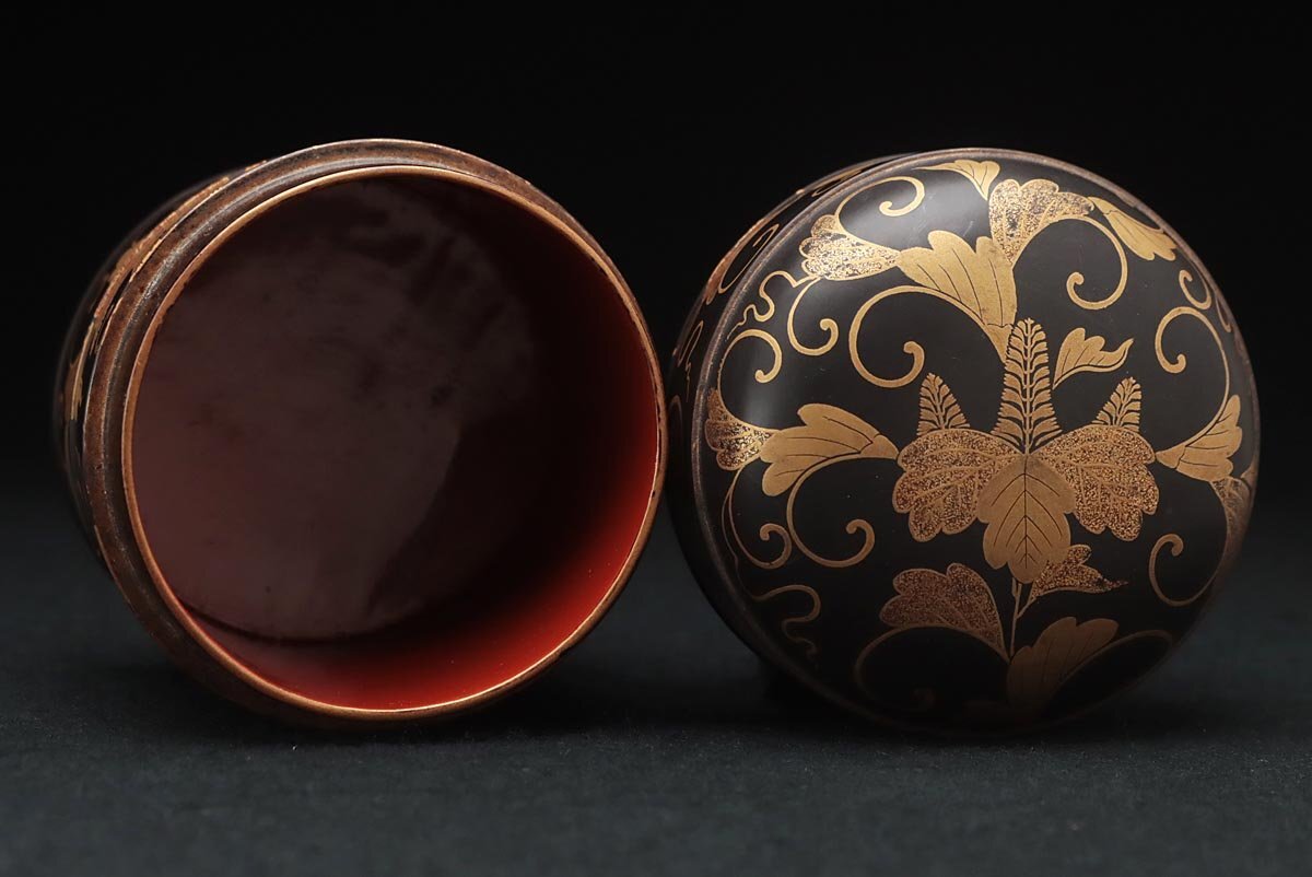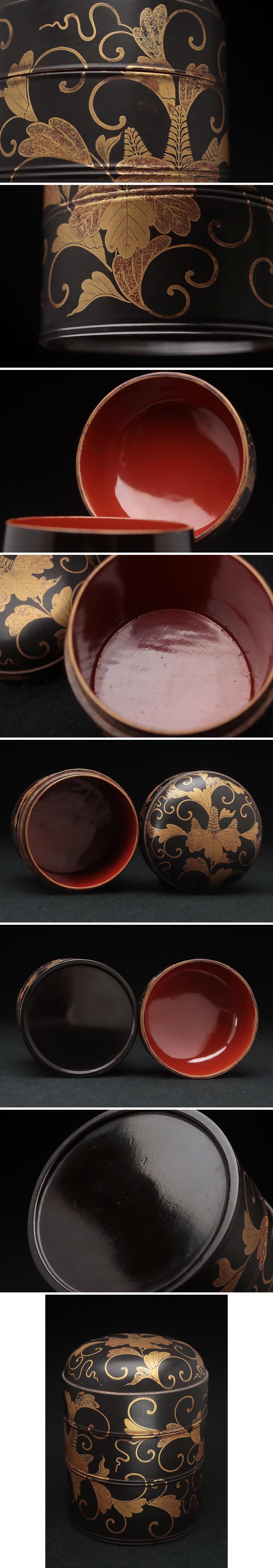 | ◆ 時代蒔絵 黒内朱 桐唐草蒔絵蒔絵油桶 高9.7cm・桐唐草金蒔絵蓋物 婚礼化粧道具 髪油容器 江戸時代 漆工芸 漆器 古美術品 ◆