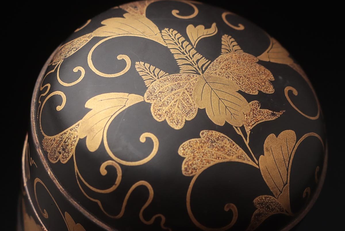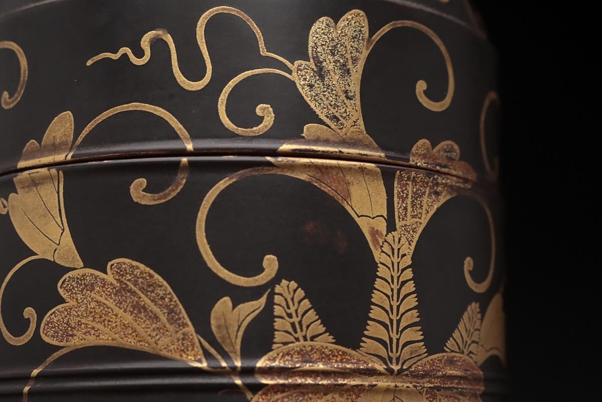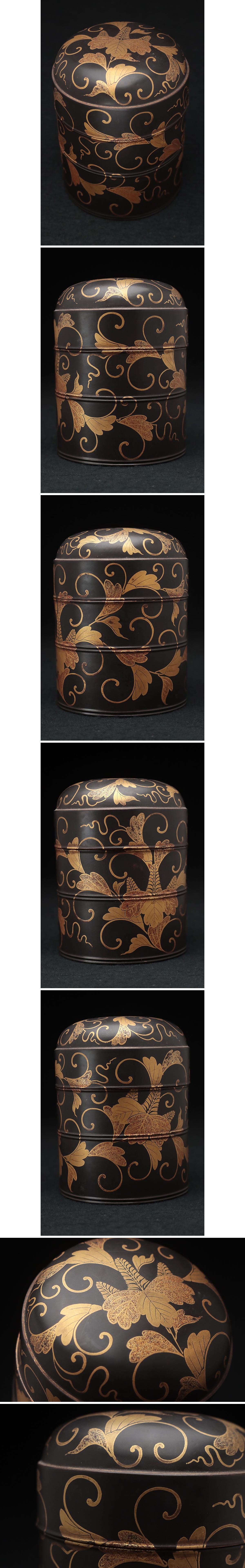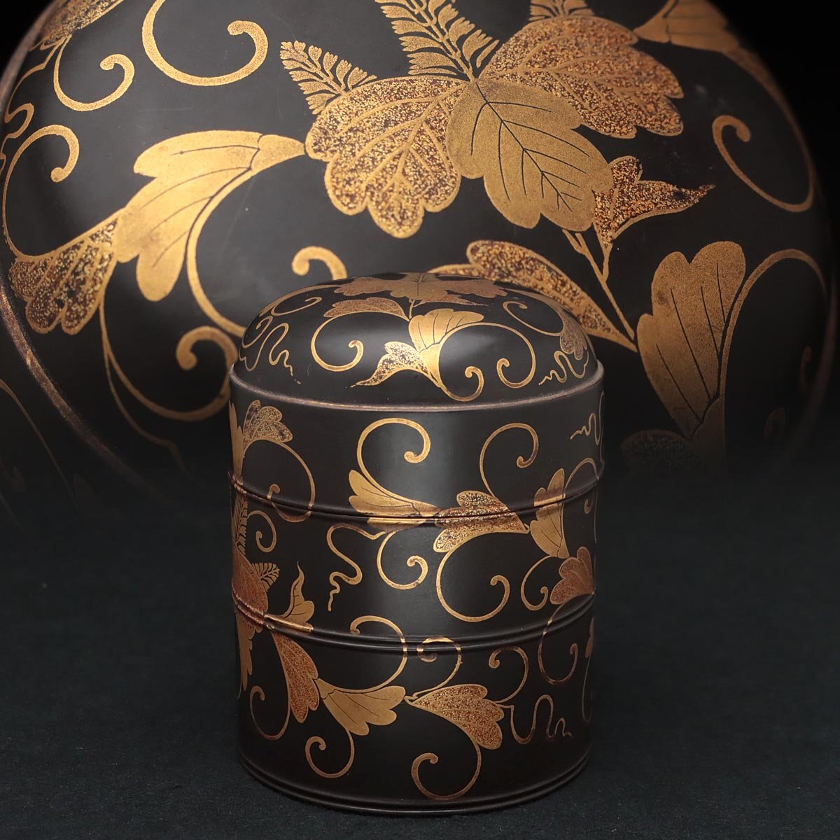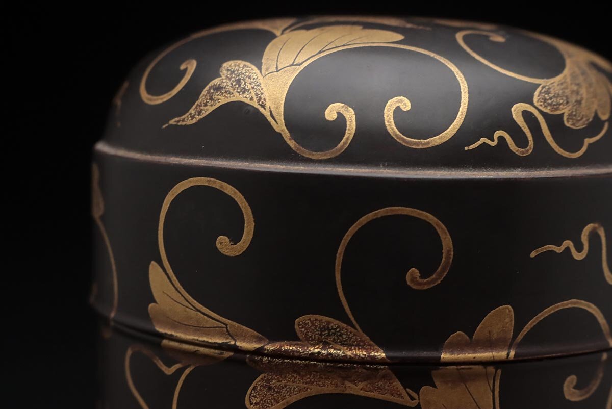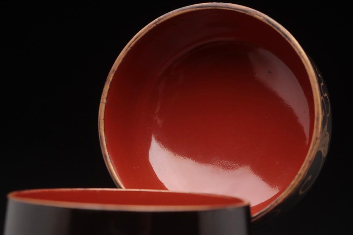 | ◆ 時代蒔絵 黒内朱 桐唐草蒔絵蒔絵油桶 高9.7cm・桐唐草金蒔絵蓋物 婚礼化粧道具 髪油容器 江戸時代 漆工芸 漆器 古美術品 ◆