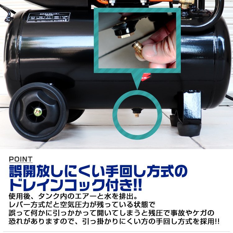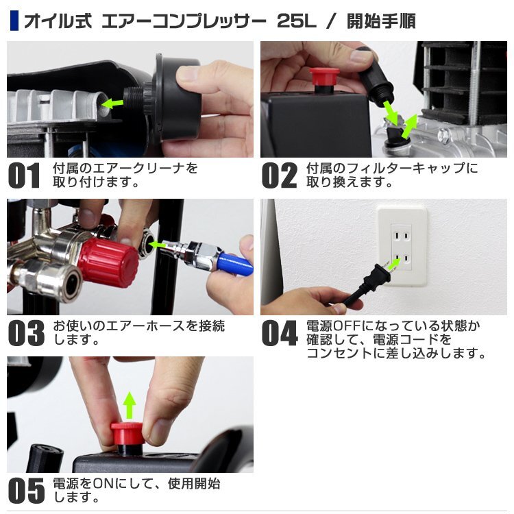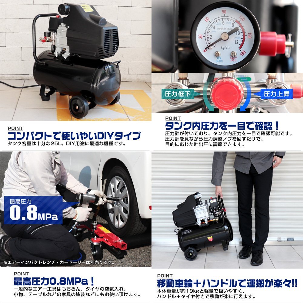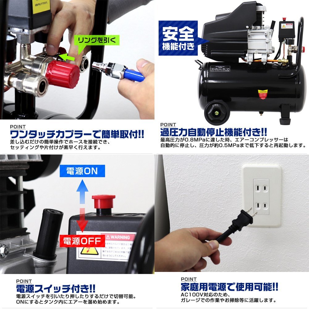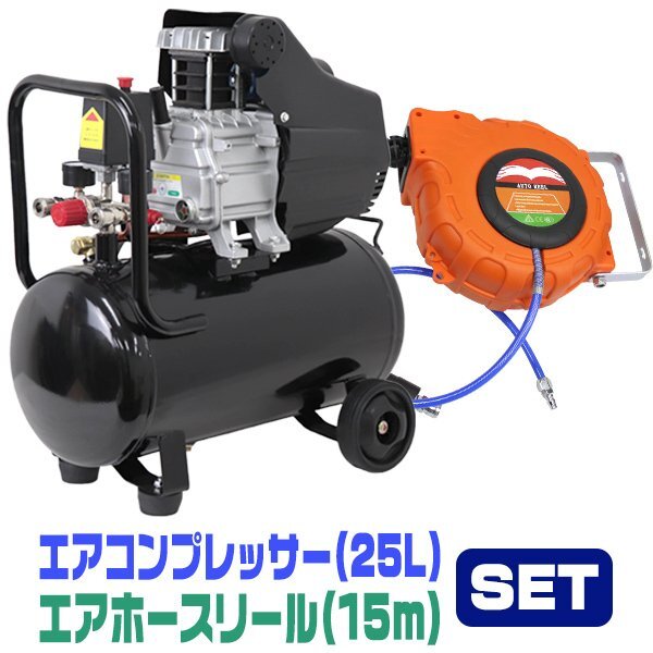お問い合わせの多かった、エアーコンプレッサーをついに入荷! エアーホースリールとのセット商品です。 ●エアーコンプレッサー ・最高圧力は0.8Mpa! ・タンク内圧力を一目で確認! ・ハンドル付きで運搬しやすい! ・ワンタッチカプラーで簡単取り付け! ・過圧力自動停止機能付き! ・家庭用電源で使用可能 ・誤開放しにくい手回し方式のドレインコック付き 【商品仕様】 サイズ(約):幅330×奥行560×高さ585mm 重量(約):19kg 電源コードの長さ(約):1.3m 電源:AC100V 50/60Hz 出力:1.5KW/1HP 消費電力:1200W タンク容量:25L 最高圧力:0.8MPa/115psl 再起動圧力:0.55MPa/75psl 無負荷回転数:2850RPM(50Hz)/3360RPM(60Hz) 吐出空気量:130L/分 連続使用時間:約1時間(タンク内を満タンに貯めてから使用した場合) 騒音レベル:80dB 【商品内容】 ・エアーコンプレッサー本体 ・フィルターキャップ ・エアークリーナー ●エアーホースリール 【商品仕様】 ・最高使用圧力:8.0kgf/c ・ホースの長さ:約15m ・エアー入力ホース長さ:910mm ・ホースの外径:12mm ・ホースの内径:8mm ・材質:ポリウレタン樹脂 ・装着カプラー:1/4NPT ・本体サイズ:幅350×奥行150×全高280mm ・重量:4.3kg |