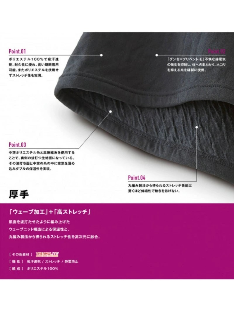 肌面を波打たせたように編み上げたウェーブニット構造による保温性と、丸編み製法から得られる高ストレッチ性を高次元に融合。