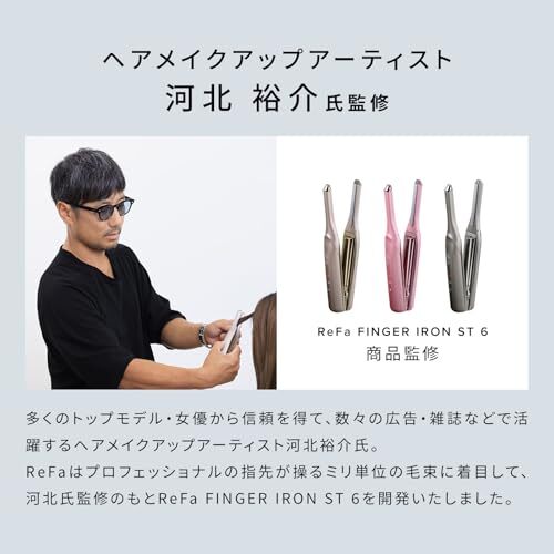 【より細かなニュアンスも簡単・キレイ・ダメージレスに】毛束をほんの少しだけ、さっとつかみ、傷めないように適切な温度でコントロール。悩みや理想に合わせたニュアンスをつくり、美しく仕上げる。そんな、プロフェッショナルがスタイリグをする際に使うテクニックを、誰もが日常で再現できるようにしたのが、6mm幅の繊細さと独自の三層構造によって作り上げられた指先型カーボンレイヤープレート。Refa独自のテクノロジーで、こなれ感や小顔※を演出できる仕上がりを、簡単・キレイ・ダメージレスに、思いのまま。※ヘアセット効果による