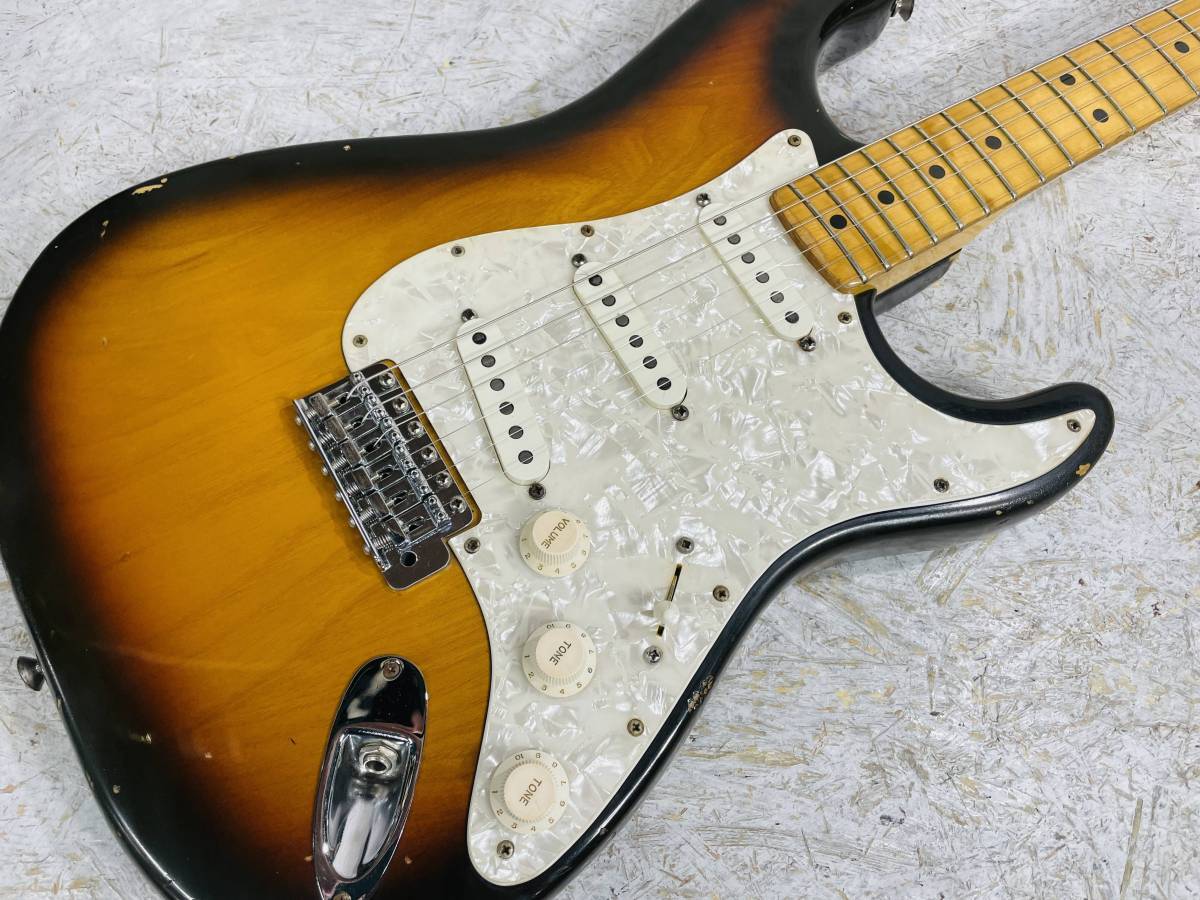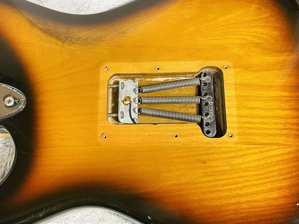 状態 : 傷、使用感があります。ペグが交換されています。1弦、2弦ペグのみ他と違いますがどちらがオリジナルか不明。ナットが交換されています。フレットは残り3割程度と、低くなっています。フレットバリ取り跡があり、指板両サイドの塗装が無い状態。ネックの塗装、ヘッド部分が焼けています。ボディー塗装は全体的に白濁、溶解箇所があります。ピックガードが交換されています。ネジが交換されています。ケース、アームが欠品しています。