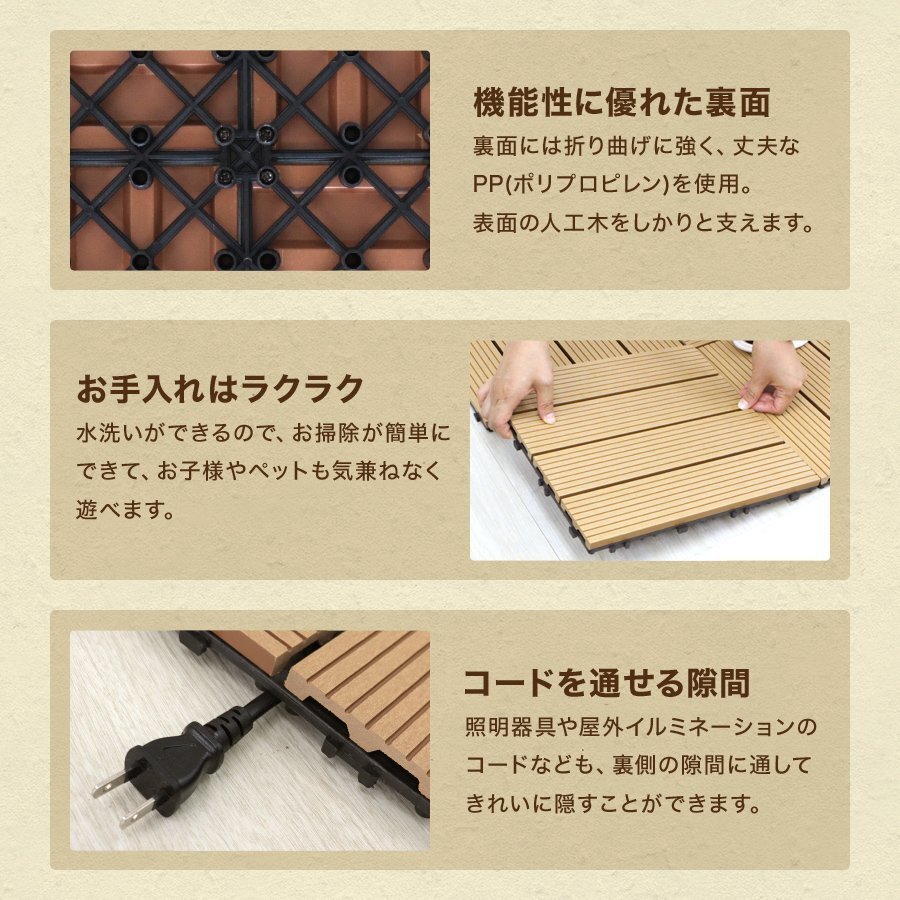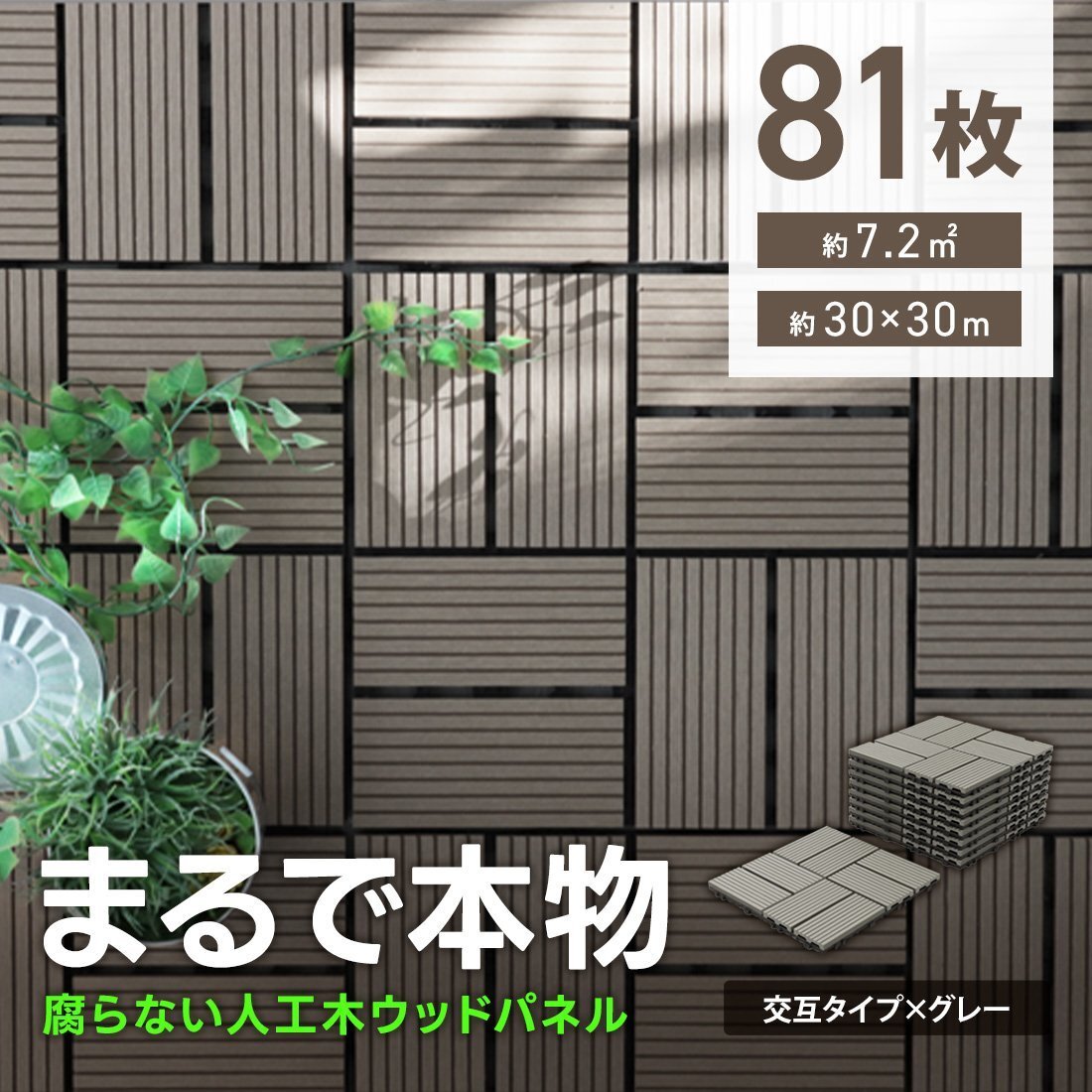 | パズルみたいにサイドの凹凸を繋ぎ合わせるだけで簡単に施工が出来るジョイント式ウッドタイル! ベランダの雰囲気を変えたり劣化してきたベランダの修復に最適! 雨や日差しによる劣化に強く耐腐食性もある人工木を使用。 55%の天然木粉と45%の樹脂で出来ており、天然木製と比べると定期的なお手入れも不要! 小さなお子様やペットにも安心。さらっとした感触でささくれや釘による怪我の心配もなし。 安全に長期間使用できる優れものです! 【商品詳細】 カラー:グレー(交互タイプ) 表面のサイズ(約):幅29.5cm×長さ29.5cm×高さ2cm ジョイント部分も含んだサイズ(約):幅30.5cm×長さ30.5cm×高さ2cm 表面隙間:5mm 重量(約):0.9kg 圧力強度:3000N 材質:WPC素材(木材・プラスチック複合材) 表面・・・人工木(天然木の木粉55%入り) 裏面・・・ポリプロピレン樹脂 【商品内容】 ウッドパネル × 81 |