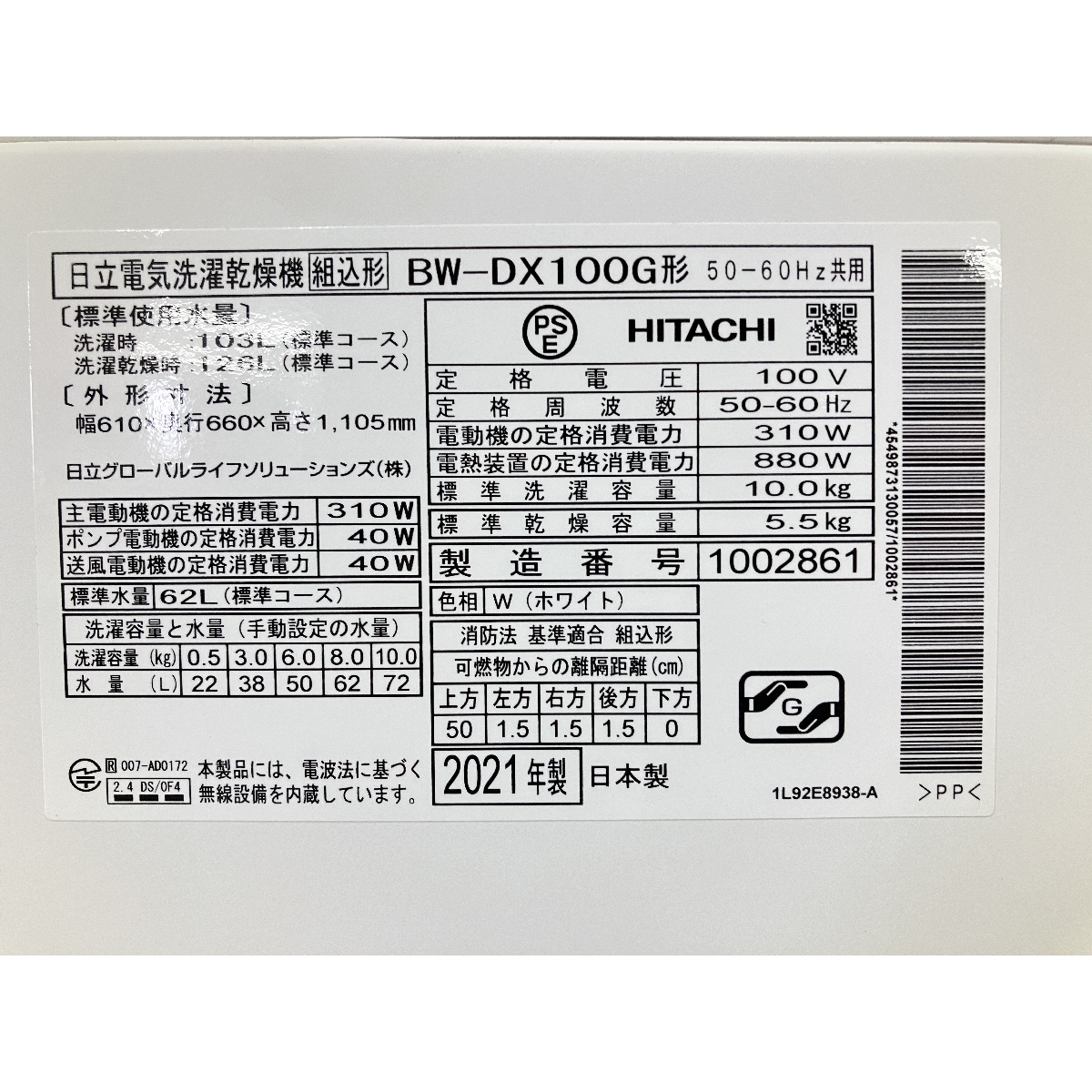 | メーカー名 | HITACHI | 型番 | BW-DX100G |