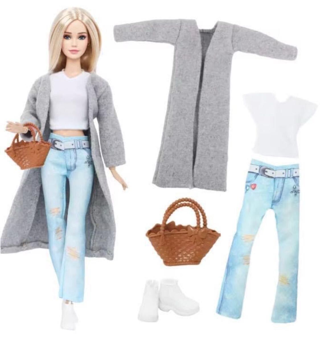 コート・Tシャツ・デニム風パンツ・バッグ・スニーカーのセットです