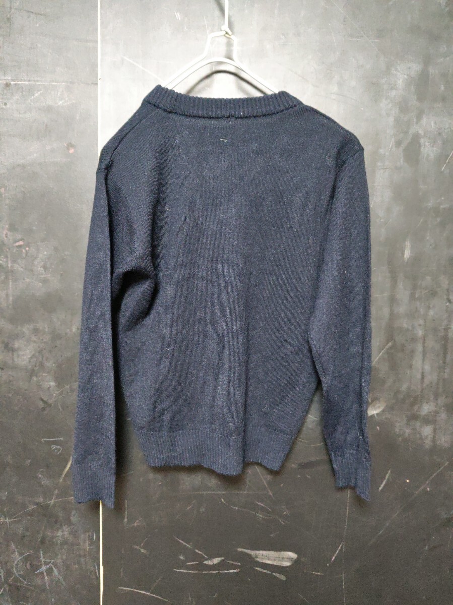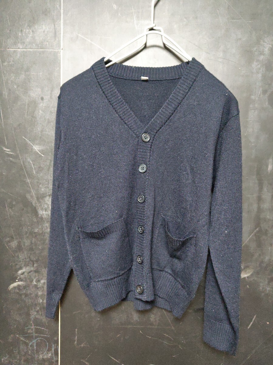 ネイビーのVネックカーディガン、前面にポケットとボタン付きのニット素材。