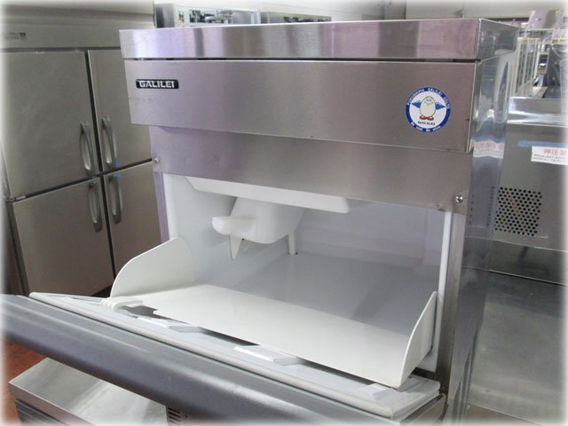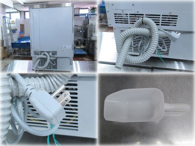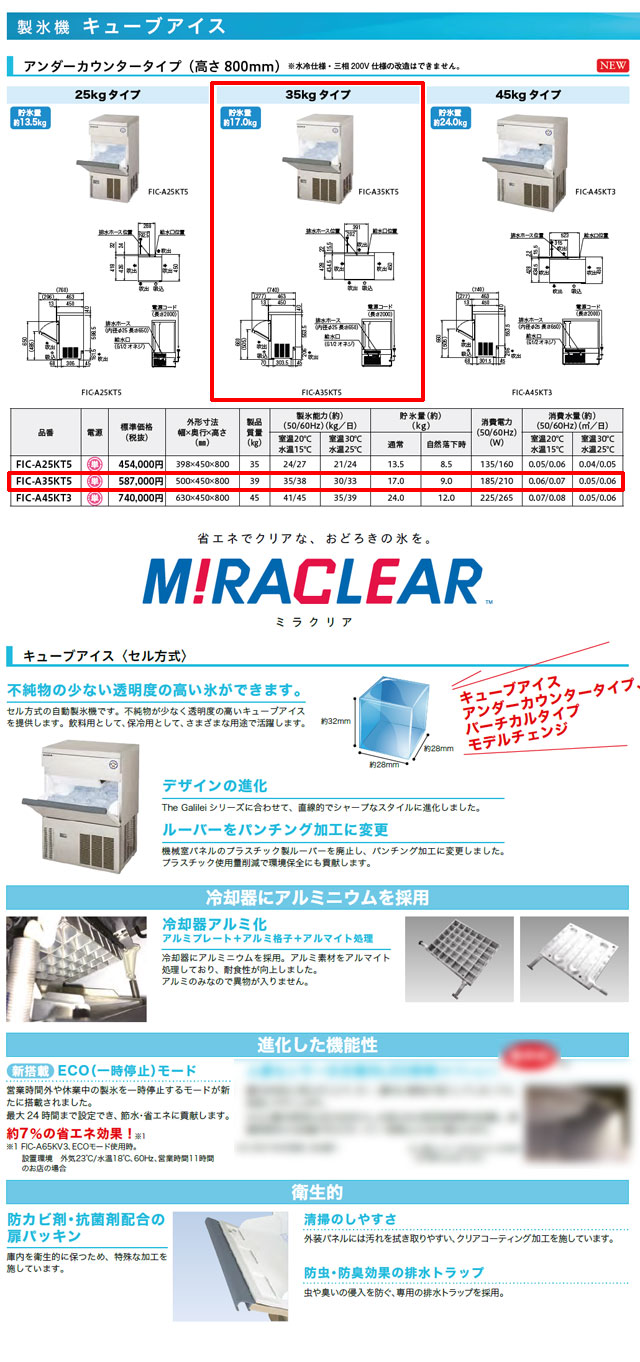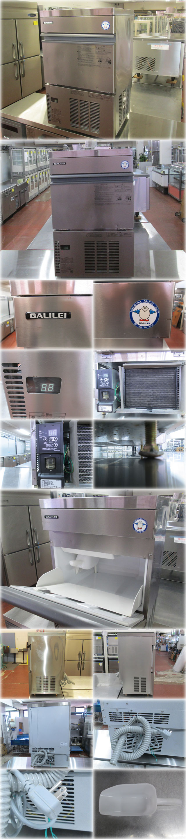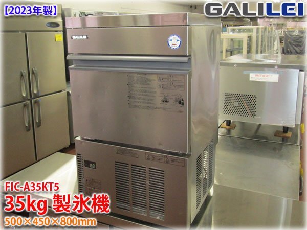 フクシマガリレイ 35kgタイプ製氷機 FIC-A35KT5 を出品いたします。 ■特徴■ 省エネでクリアな、おどろきの氷を。 ミラクリア 不純物の少ない透明度の高い氷ができます。 セル方式の自動製氷機です。 不純物が少なく透明度の高い キューブアイスを提供します。 飲料用として、保冷用として、 さまざまな用途で活躍します。 デザインの進化 The Galilei シリーズに合わせて、 直線的でシャープなスタイルに進化しました。 ルーバーをパンチング加工に変更 機械室パネルのプラスチック製ルーバーを廃止し、 パンチング加工に変更しました。 プラスチック使用量削減で環境保全にも貢献します。 冷却器アルミ化 アルミプレート+アルミ格子+アルマイト処理 冷却器にアルミニウムを採用。 アルミ素材をアルマイト処理しており、 耐食性が向上しました。 アルミのみなので異物が入りません。 ECO(一時停止)モード 営業時間外や休業中の製氷を 一時停止するモードが新たに搭載されました。 最大24 時間まで設定でき、 節水・省エネに貢献します。 防カビ剤・抗菌剤配合の扉パッキン 庫内を衛生的に保つため、特殊な加工を 施しています。 ECO(一時停止)モード 営業時間外や休業中の製氷を 一時停止するモードが新たに搭載されました。 防虫・防臭効果の排水トラップ 最大24 時間まで設定でき、 節水・省エネに貢献します。 ■仕様■