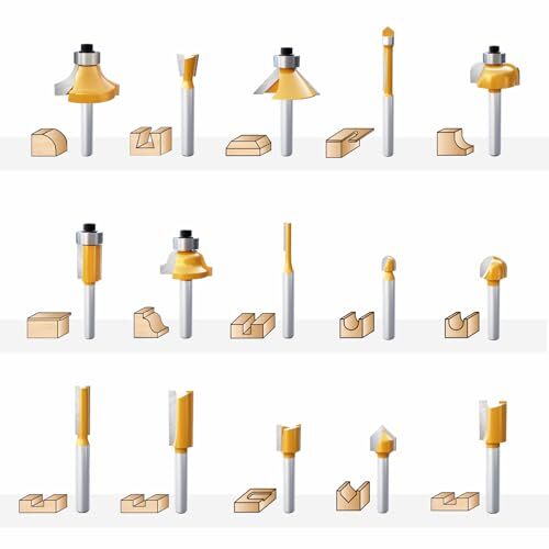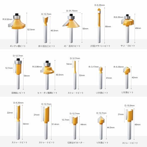 ▲15本組, 色: イエロー, シャンク径: 6㎜。溝ほり 面取り 飾り面加工用。ルータービットの刃部にYG6Xタングステン鋼合金を採用し&表面塗装, 切削力に優れ美しく仕上げられます, 最大の強度と耐久性を実現ことができます。