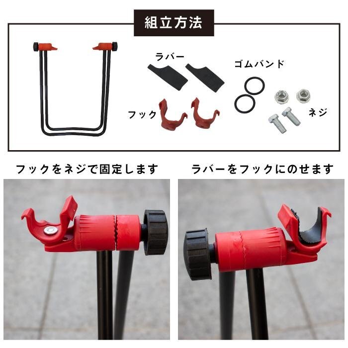 | ロードバイクやマウンテンバイク、クロスバイクなどに最適な自転車1台用スタンド。 スタンドを開いた状態で、上から車体を乗せるだけで取り付けできるチェーンステーで支えるタイプのメンテナンススタンドです。 メンテナンスだけでなく室内展示、室内保管用にご使用頂けます。 メンテナンスの邪魔にならず後輪を浮かせて安定して支えてくれますので 従来のクイックで支えるものより、装着が楽になるスタンドです。 ・ゴムバンドで車体をとめれるのでとても安定します。 ・クイックに挟むスタンドが苦手な方におすすめ。 ・組立も簡単で、使わないときは折りたたむ事可能です。 本体サイズ 材質:アルミ合金 対応:20インチから700Cまで カラー:ブラック、オレンジフック 付属品:フックx2、取付ネジ キズ、汚れがある場合がございます。正常に動作しない場合がございます。ジャンク扱いでお願いします。ノークレーム、ノーリターン | |