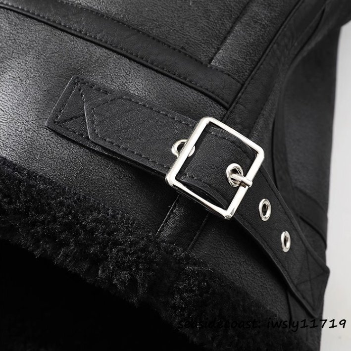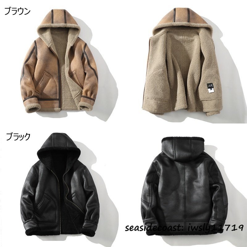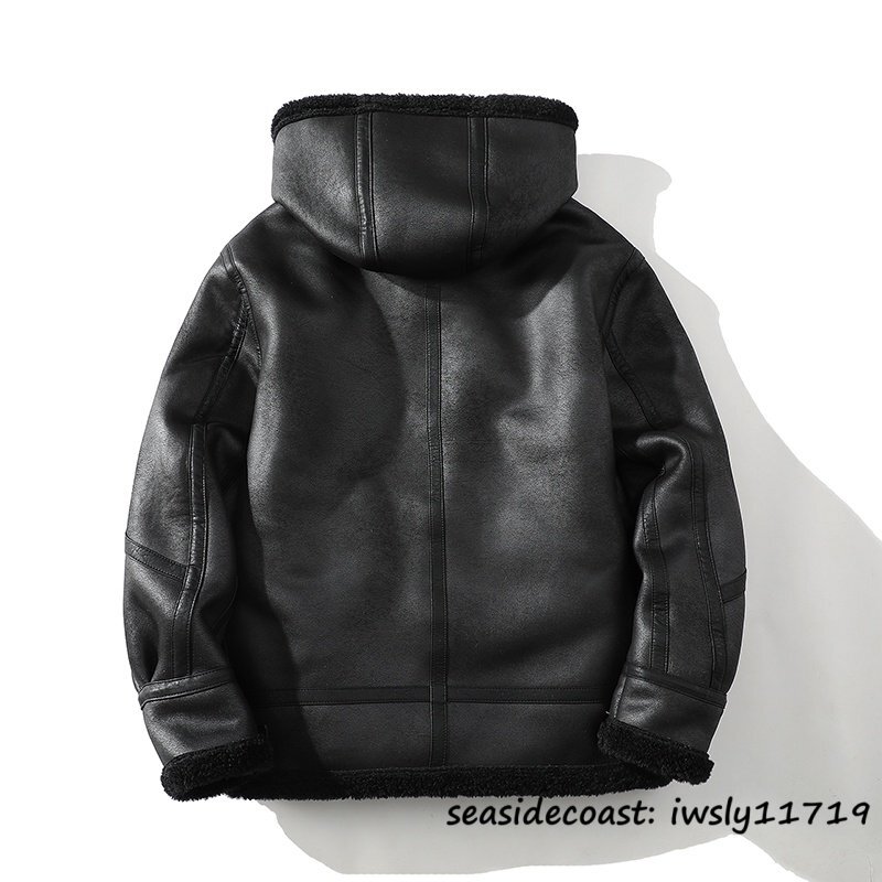 最上級*ライダース フード付き ムートンコート メンズ レザージャケット ブルゾン ジャンバー 防寒 厚手 フライトジャケット ブラック XL