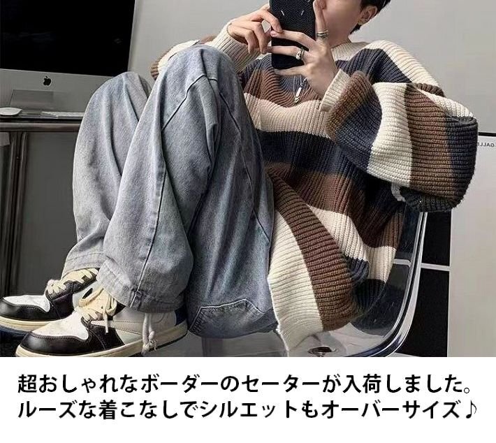 大きいサイズ オーバーサイズ セーター メンズ レディース ボーダー border knit おしゃれ 7987293 ブラウン 新品 1円 スタート