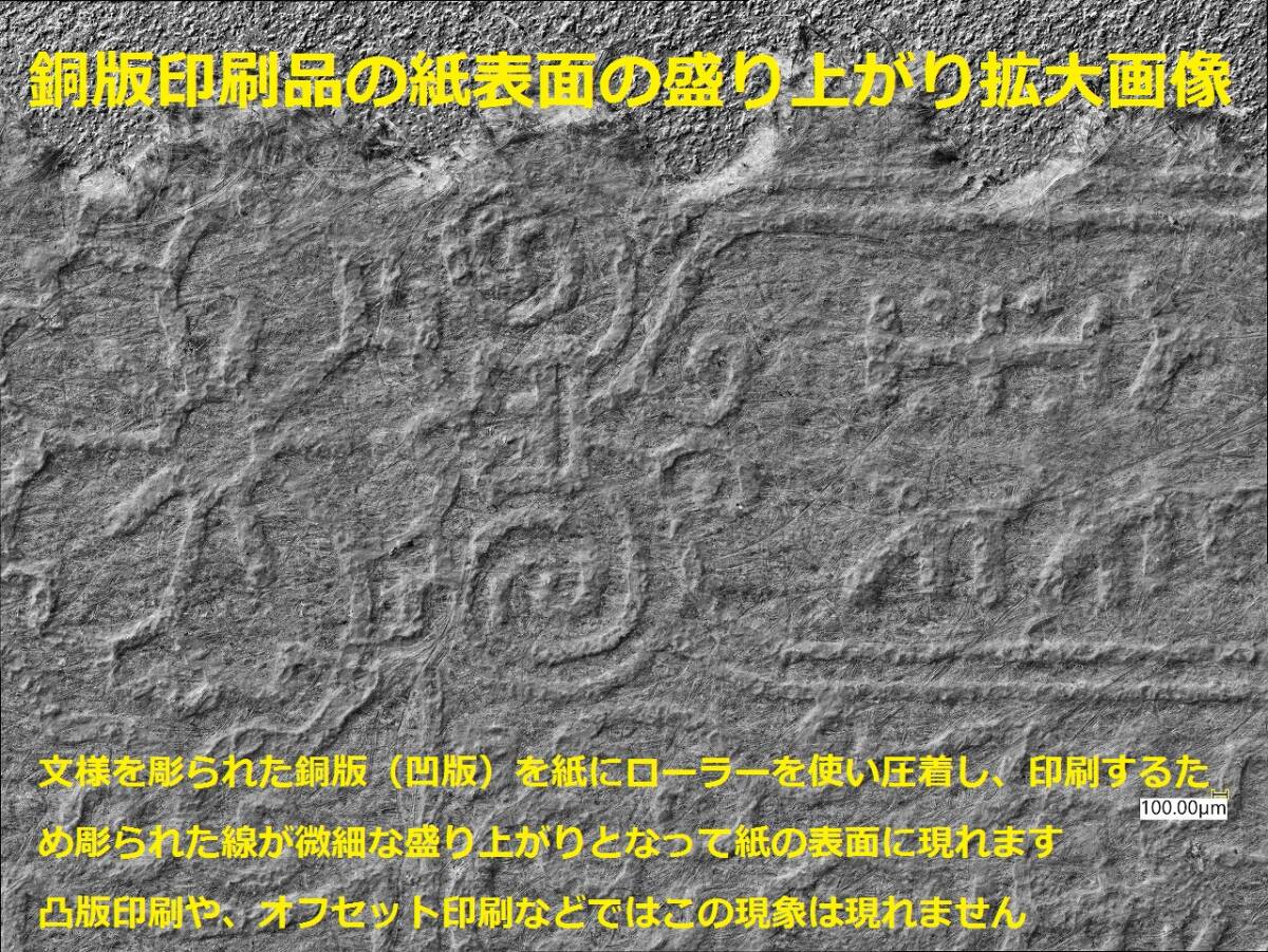 よく余白部に全く色のついていない綺麗な手彫を見かけますが、凹版印刷の場合、余白部に全く色がないというのは、絶対にあり得ない特徴です