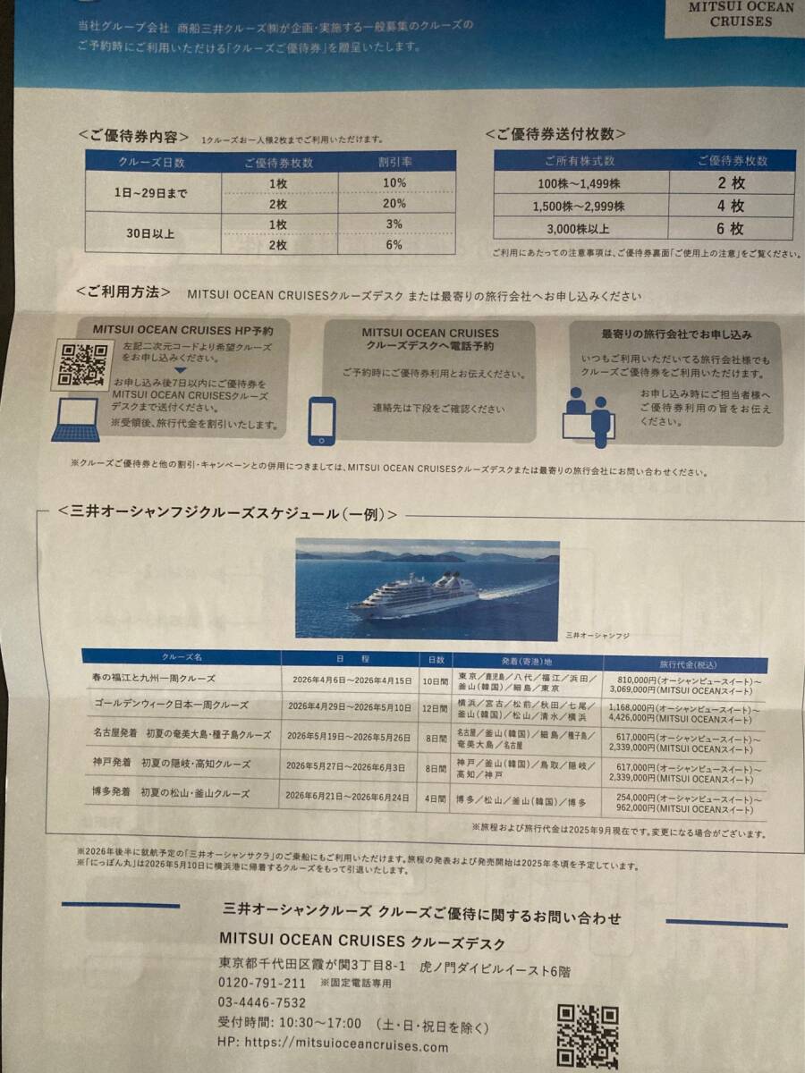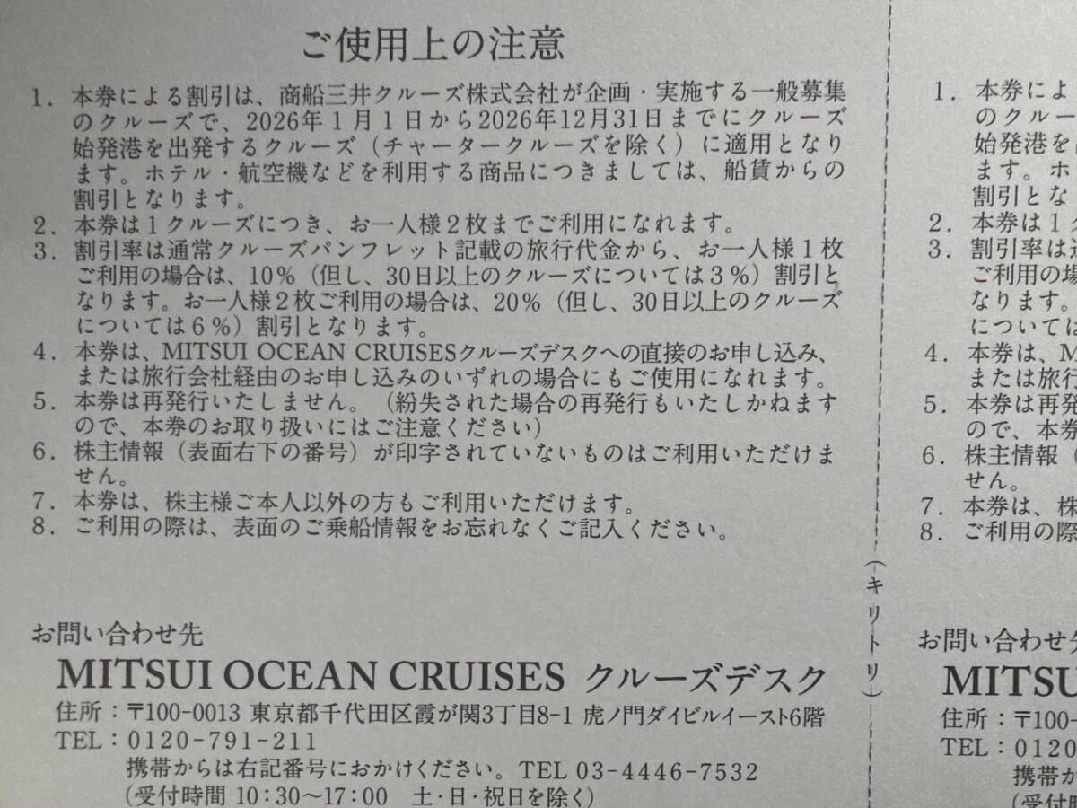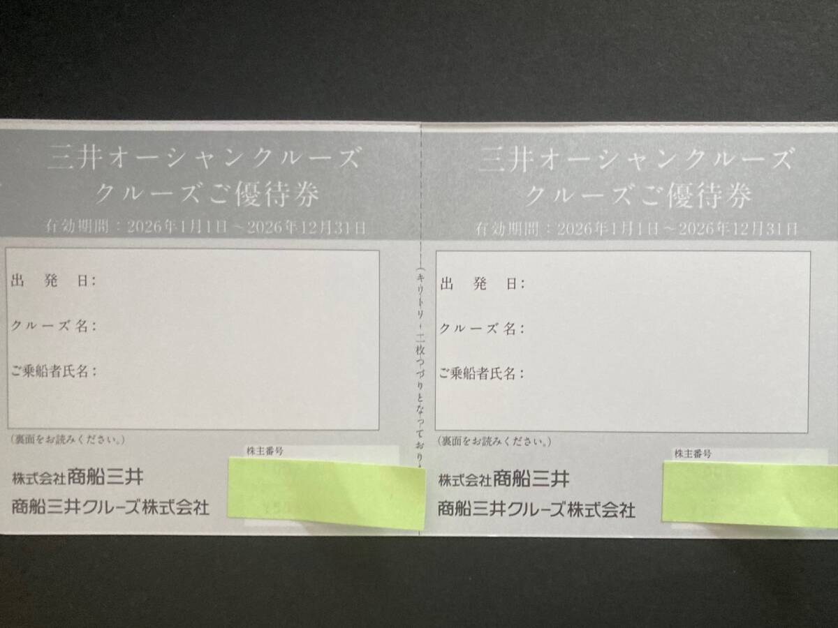 商船三井株主優待「三井オーシャンクルーズ クルーズご優待」券2枚です。