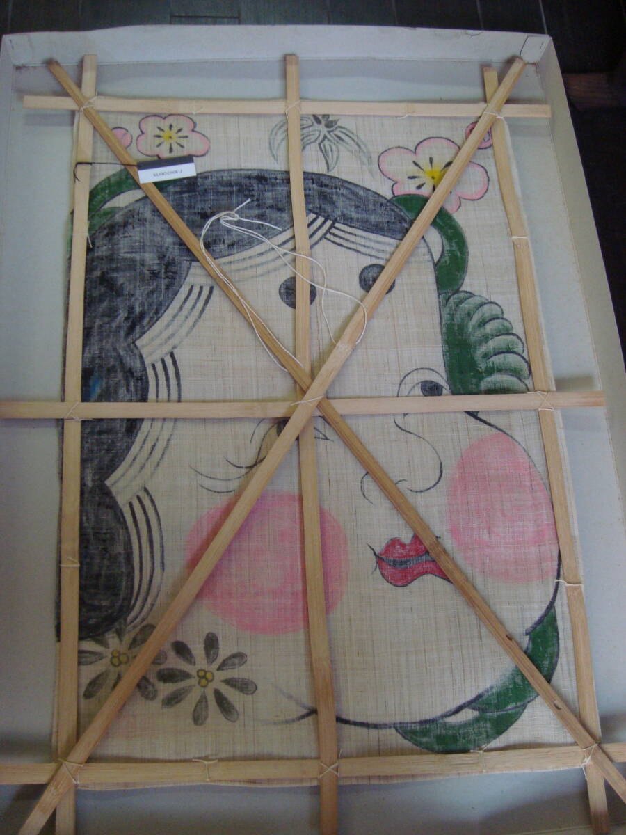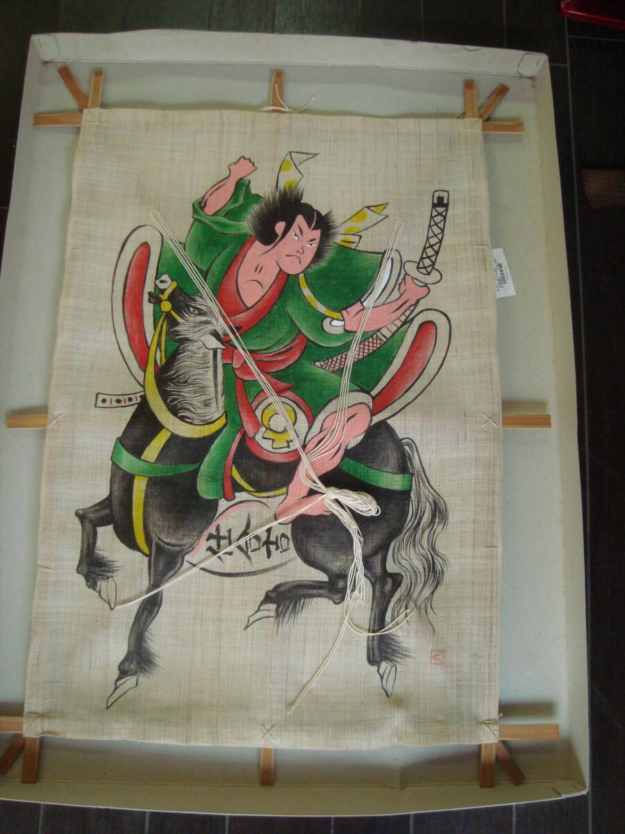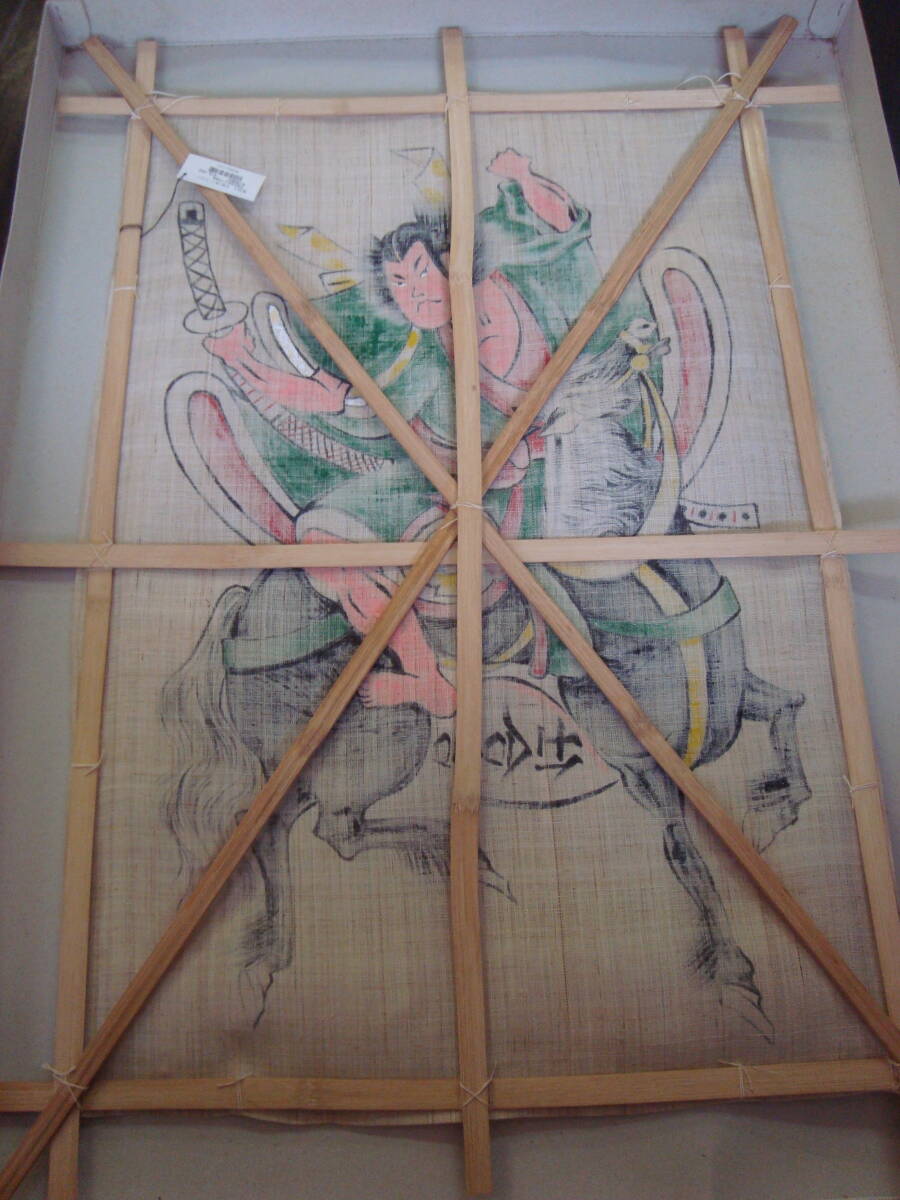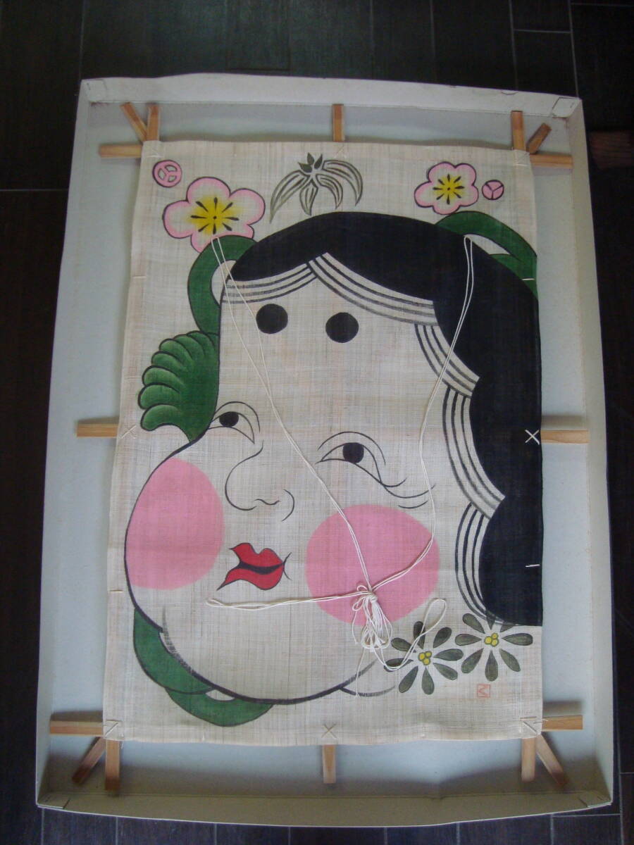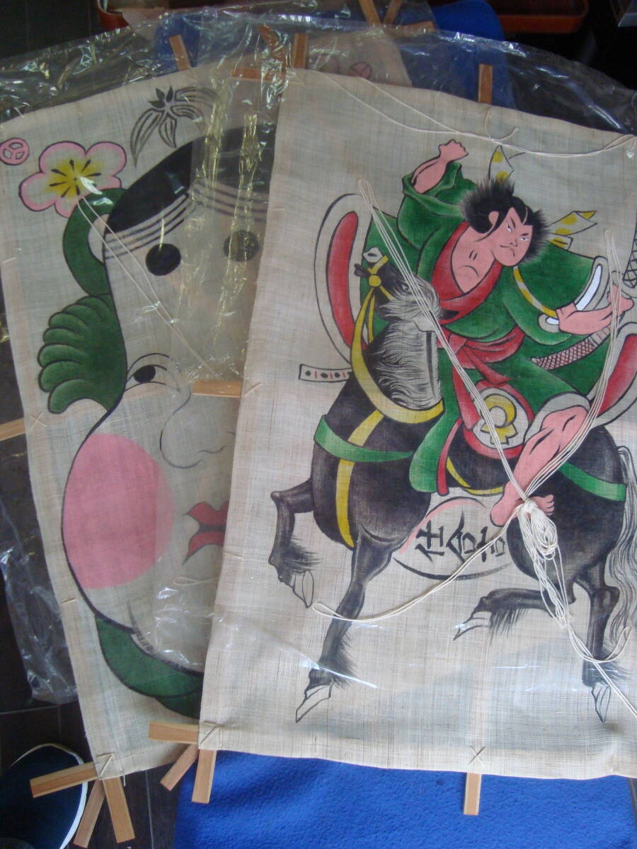 「廃業人形店より【京都『くろちく』手描き麻布 和凧2枚組【武者絵・お福さん】 箱入り未使用サイズ 78x58cm」 1点 定価1万五千円 2点30.000円。 箱は経年のよごれイタミあり初だし現状渡し。スレヨゴレある古い物とご理解の上ご入札下さい。