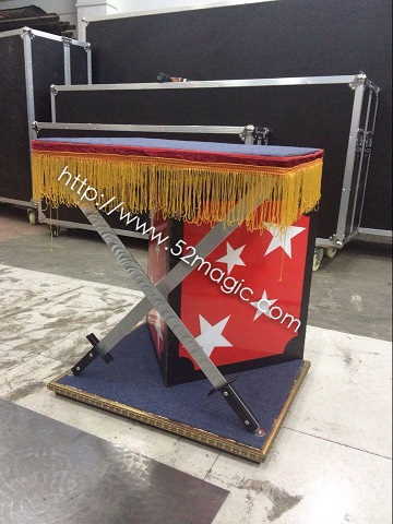 つい立板と2本の金属製の剣で支えられたカーペットが示されます。 アシスタントがそのカーペットの上にあぐらをかいた状態で座ります。そして、術者はつい立板をカーペットの下から引き抜いてしまいます!信じられないことにカーペットは2本の剣だけで支えられているのです!! そして、なんと!なんと! 唯一支えていた剣も1本、2本と取り去られ、カーペットに乗ったアシスタントは完全に空中に浮いてしまったのです!!!  術者はカーペットの真下に入り込み、余裕で横になりながら何の支えもないことを示し、さらに、大きな輪でカーペットに乗ったアシスタントを通してあらためられるのです。 再び、つい立板がカーペットの下に置かれ、アシスタントがカーペットから降りて演技は終わります。
