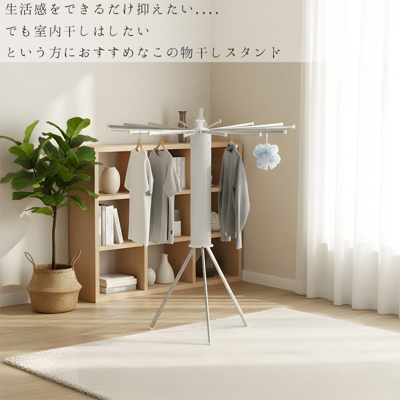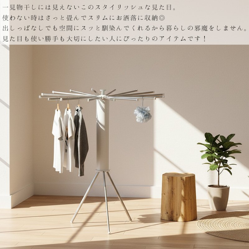 ![]() ■使う場所や洗濯物の量に合わせて形を変えられる 最大16本の物干し竿で大容量の洗濯物にも対応! 狭いスペースでも広いスペースでも、柔軟にサイズを調整でき、必要な分だけ竿を出して使えるので、無駄なく効率よくお洗濯ができます。 さらに、竿の数を減らしてコンパクトに使うことも可能で、家族の人数や場所に応じて使い方を変えることができます。 ■使わないときは省スペースに収納 使わないときは省スペースに収納。折りたたむと直径14cmのコンパクトなサイズになり、家具の隙間に収納でき、場所を取りません。狭い部屋でもスッキリ片付けられ、収納時に邪魔にならず、必要な時にサッと取り出してすぐに使えます。収納時も場所を取らないので、賢くスペースを活用できます。 ■広げて上にかぶせると布団も干せる 広げて上にかぶせると布団も干せるので、忙しい日常でも簡単に大きなアイテムを干すことができます。布団やシーツをしっかりと乾かせる広いスペースを確保でき、風通しが良いため、効率よく乾燥させることができます。 ■商品詳細 カラー:ホワイト×シルバー サイズ(約):展開時:高さ121cm、横幅110cm / 収納時:高さ70cm、横幅14cm 重量(約):2.8kg 素材:本体:プラスチック / 先端パーツ、ハンガー:アルミ 耐荷重(約):20kg |