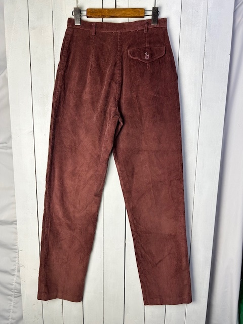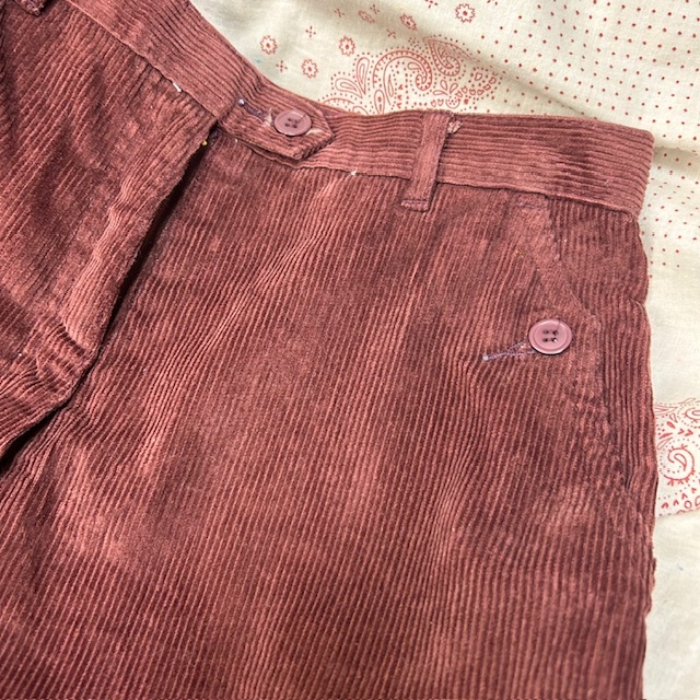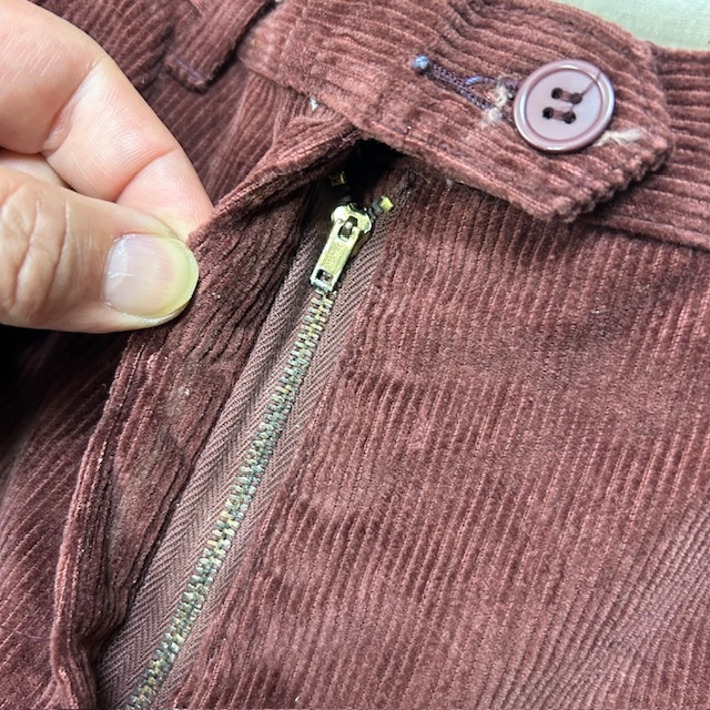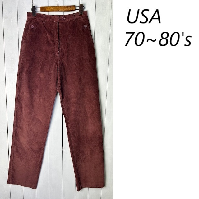 ●商品説明・・・アメリカ古着になります。70年代~80年代頃のオールド・ヴィンテージのゆったりワイドめなお尻・太もも周りから裾にかけて気持ちテーパードした、バギーのような全体的に程よくゆったりしたシルエットの中太畝のコーデュロイパンツです。ジッパーは片ツメ式のYKKで、エレメント部に変色が見られますが、スムーズに開閉します。ボリューム感があるのでサスペンダーで吊っても可愛いと思います。素材はコットンで、色は茶色(ブラウン)です。サイズ表記はUSA 11で、M~小さめL程度のサイズ感かと思います。