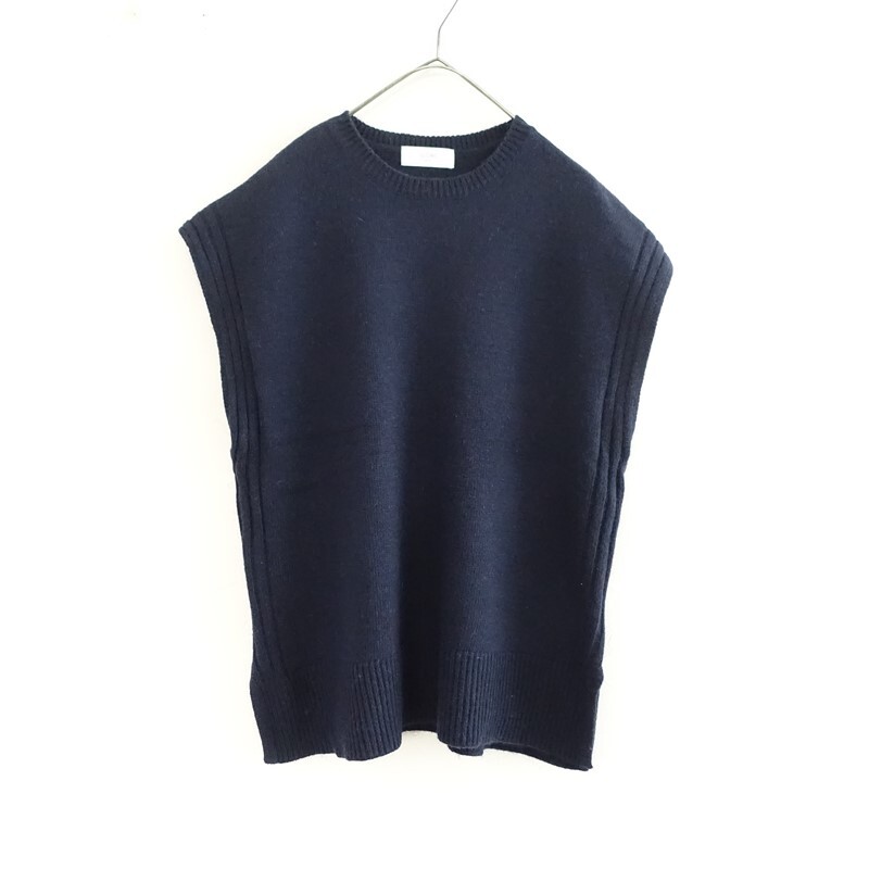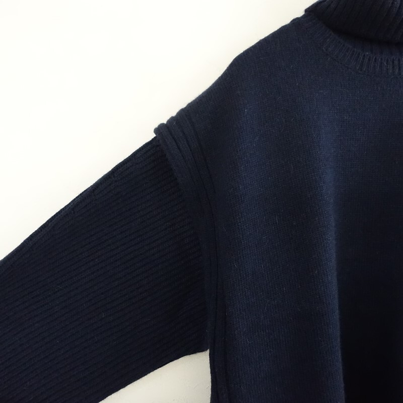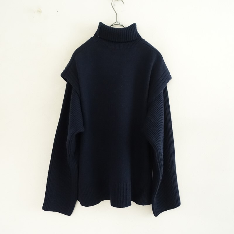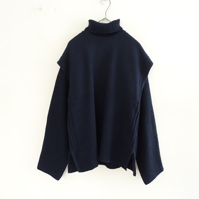 | SLOBE IENAの3wayニットセットです。カラーはネイビーで、ニット素材で仕立てられています。クルーネックのベストとショート丈のタートルネックがセットになったアイテムで、セットで着用出来るのはもちろん、それぞれ単品使い出来る3WAY仕様です。定価(メーカー希望小売価格) 13,200円の商品です。 |