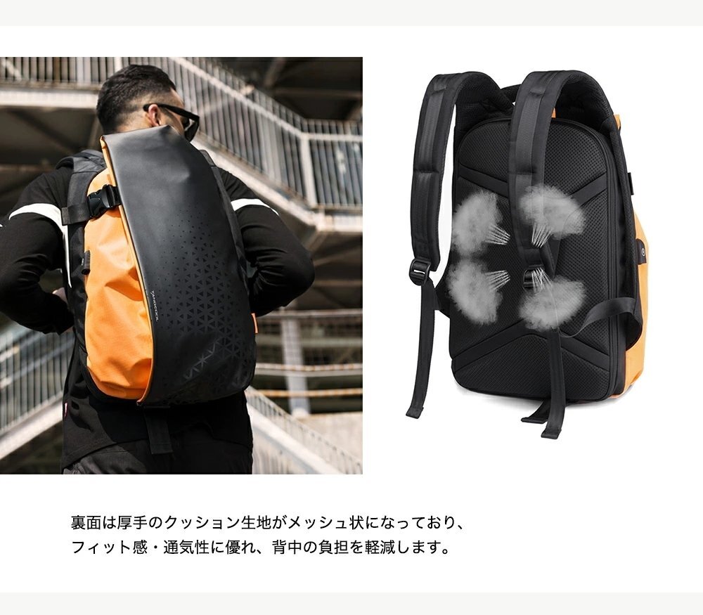 【防水 通気】表面は丈夫な防水高密度ナイロン生地で、雨の日もカバンの中身をしっかり守ります。また、磨耗に強く耐久性があります。裏面は厚手のクッション生地がメッシュ状になっており、フィット感・通気性に優れ、背中の負担を軽減します。