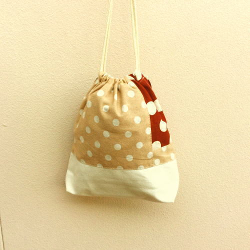 【入学、入園!】500円ベージュドットパッチワーク巾着袋 【手作り小物】