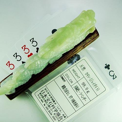 | 品名 /【SJ】新品 龍 ラベンダーヒスイ 手彫りカービング 材質 / 天然ラベンダーヒスイ 縦・横 / (約)5.0cm 10.5cm 厚さ / (約)2.0cm 総重量 / 99g 日宝協ソーティング付き 【SJ】/ 新品製品 品番 / ADG297 参考小売価格 / 190,000円 | |