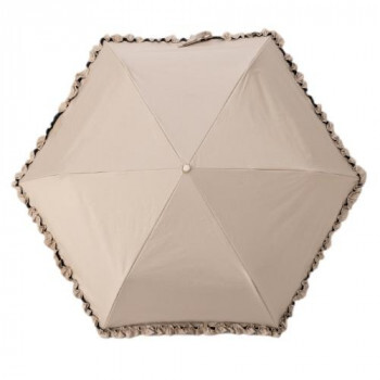 | 雨の日でも晴の日でも使えるレディース雨晴兼用折傘。手開きタイプです。裾のフリルや持ち手の極小ラメが可愛い、女性らしいデザインです。 |