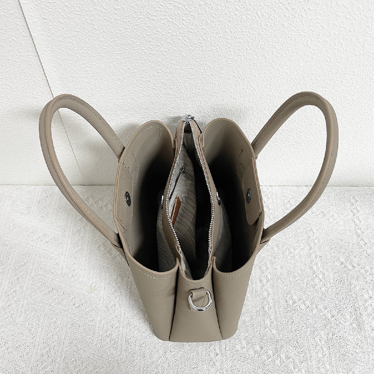 本体は高品質牛革レザーを使用しており、柔らかでシボが美しく、女性のニーズにしっかり応えていると思います。マットな質感のレザーで高級感がさらにアップ!使えば使うほど味が出る本革の魅力を堪能下さい。しかも、本革で汚れにくく、耐久性に優れているので長く愛用できます。