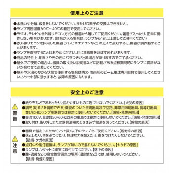 | 仕様 | 交流電源:100V 50/60Hz共用 口金サイズ:E26 定格消費電力(W):14.0 定格入力電流(A):0.23 設計寿命(h):40000 全光束(lm):1350 光色:昼光色相当 ビーム光束(lm):330 ビーム角(度):30 中心光度(cd):2600 防水設計:IP65 ※防水、防雨形のビーム電球専用器具使用時 |