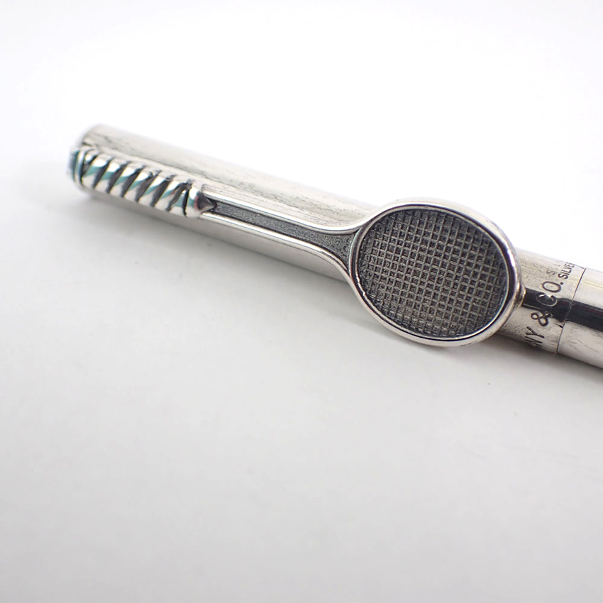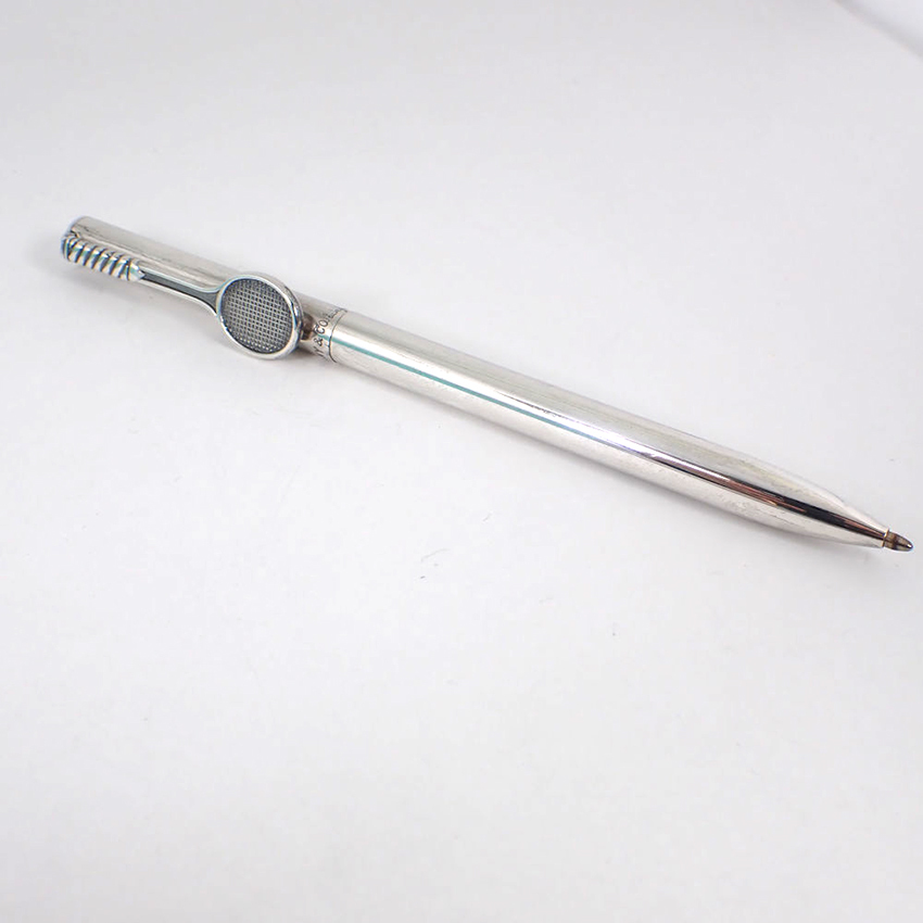 テニスラケットのモチーフがレアなボールペンです。 シルバー専用の洗浄済みです。
