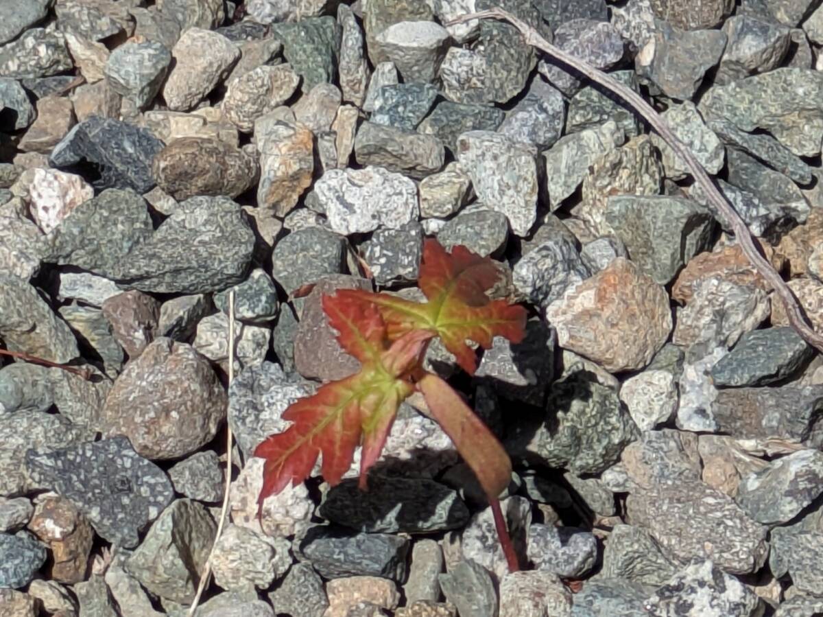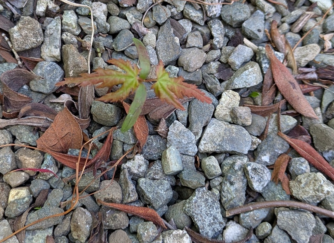 ★発芽しました。2025/4月撮影・・・年末前後に自然落下した種子が、年明け毎年3月~5月に発芽しています。冬を土の中で過ごし、温かい春を迎えると目を覚まし、土の中から芽を出してきます。(自然落下のため、地表に近くごく浅い場所になると思います。)
