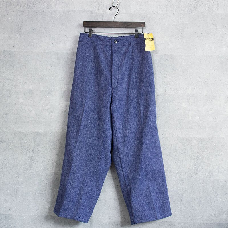 スイス軍放出のアンティークデニム素材のワークパンツの貴重なデッドストック。 恐らく50年代ぐらいのブルーコバート生地を使用したスイス軍ワークパンツがデッドストックで入荷致しました。近年見かける事の少なくなった独特の風合いを持った薄手のブルーコバート生地が採用されています。 ベルトループは付きませんが、様々な体型をカバー出来るようにウエスト部分にゴムが備わっており、ウエストサイズに合わせてボタンで留める仕様になっています。袋状のポケットも備わっているのも嬉しいポイントです。レングスは少し短めに作られている為、スッキリとした印象です。 サイズ54/64はウエスト95から110cm/総丈103cm/股下68cm/もも幅38cm/裾幅24cm 程度。 沖縄離島を除く全国元払い500円でお送りいたします。落札価格にプラスでお願いします。