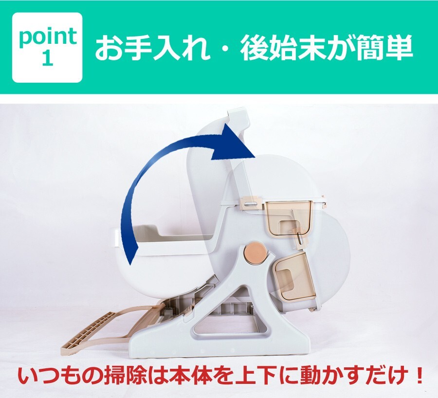 | ・トイレ本体を傾けるだけでお手入れ、後始末が完了! 手を汚さずに簡単に掃除が出来ます。 ・工具などの事前準備不要、女性でも簡単に組み立てが出来ます。 | ||||||||||||