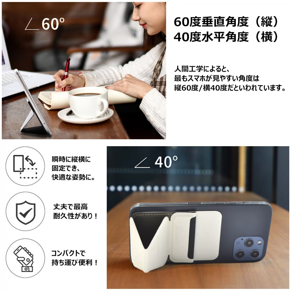 わずか0.5秒で瞬時にスマホを60度に固定し、縦横に最も見やすい角度でお使いいただけます♪