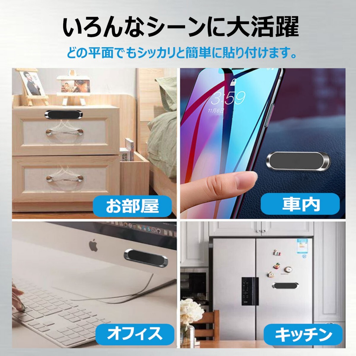 とても便利!付属のマグネットシートであらゆる場所にスマホを設置! (車内でモニターとして、キッチンでレシピを見ながらお料理をしたり、お風呂の壁に貼り付けて浴槽テレビとして使ったり色々なところにスマホを設置できます)♪