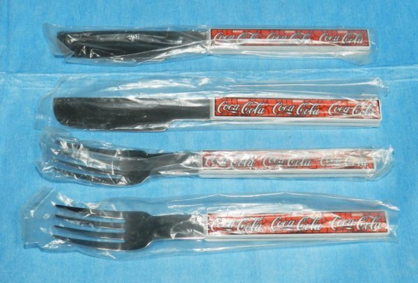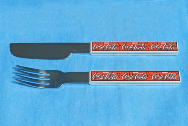 古いコカ・コーラのナイフとフォークのセットです。未使用で美品です。キャンプやなどいかがですか。クリックポスト185円での発送となります。