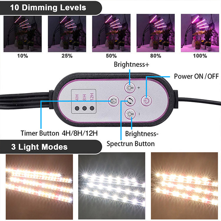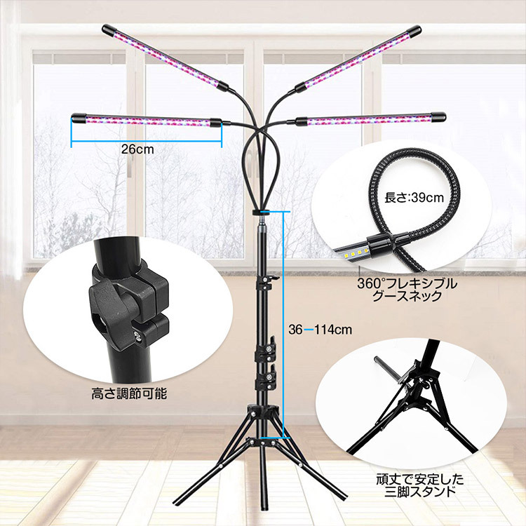 ■4ヘッド式高出力植物ライト:この育成ライトは、12個の赤色LED、28個の白色LED、40個の暖黄色LEDを搭載し、40Wのパワーで植物の光合成と成長を最適にサポートします。室内植物の育成や家庭菜園、観葉植物のケアに理想的です。 ■3色切り替え機能:赤、白、暖黄色の光を手軽に切り替え可能。植物の成長段階や季節に合わせて最適な光環境を提供でき、効率的に植物の発芽、成長、開花をサポートします。 ■調光機能・タイマー機能付き:10段階の調光設定で光の強さを調整でき、4時間、8時間、12時間の3段階タイマー機能も搭載。リモコンで操作可能なので、手軽に最適な設定が可能です。タイマー機能を使用することで、毎日自動でオン・オフが切り替わり、管理も簡単です。 ■柔軟な360度調整と三脚スタンド:360度のフレキシブルなネックを備えた4本のライトアームが付いており、さまざまな角度から植物に光を当てられます。三脚スタンド付きで高さ調整も簡単。さまざまな植物や成長環境に対応します。 ■USB給電で省エネ設計:USB給電対応で経済的に使えます。適切な消費電力と低発熱により、長時間使用しても安全かつ省エネルギー。LEDの寿命が長く、電力を無駄にすることなく植物の育成をサポートします。 ■ご注意:アダプタは付属していませんので、5V/3Aのアダプタをご用意ください。 | |