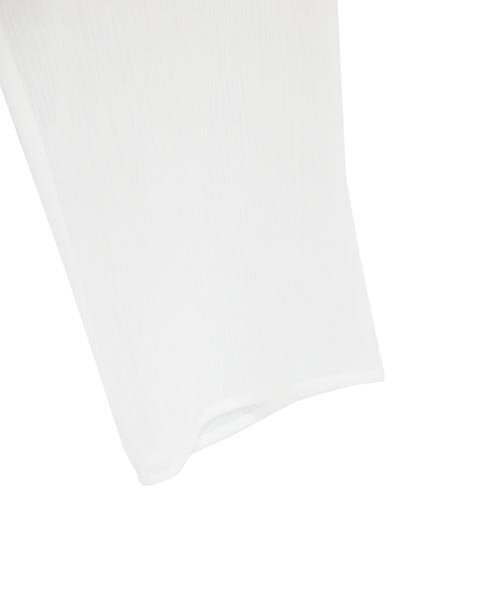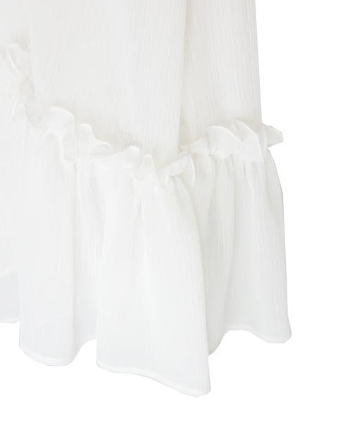 | シアー生地のフェミニンなトップス。裾にフリルで甘目デザイン。パンツにあわせてフォクシースタイルが楽しめます。身頃部分に裏地があります。 |