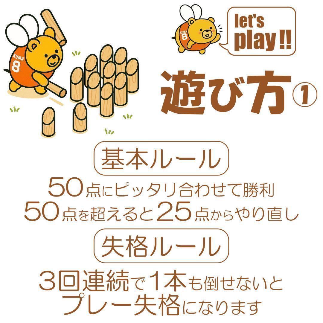 投棒を投げ、スキットルを倒します。 スキットルを倒し、そのスキットルに印字された数字が獲得できたり、複数のスキットルを倒したり、スキットルの数と同等のポイントを獲得します。 めざせ50点!