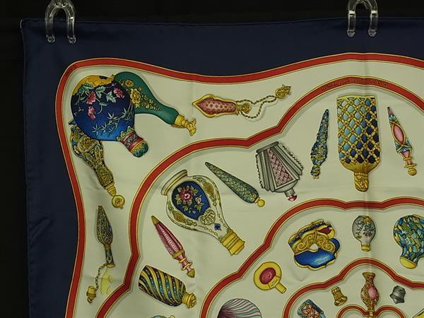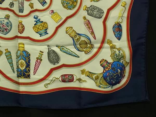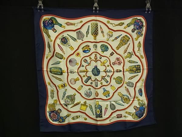 1円 ■美品■ HERMES エルメス Qu importe le flacon【香水瓶】カレ90 シルク100% スカーフ ストール ブルー系×マルチカラー BT0348