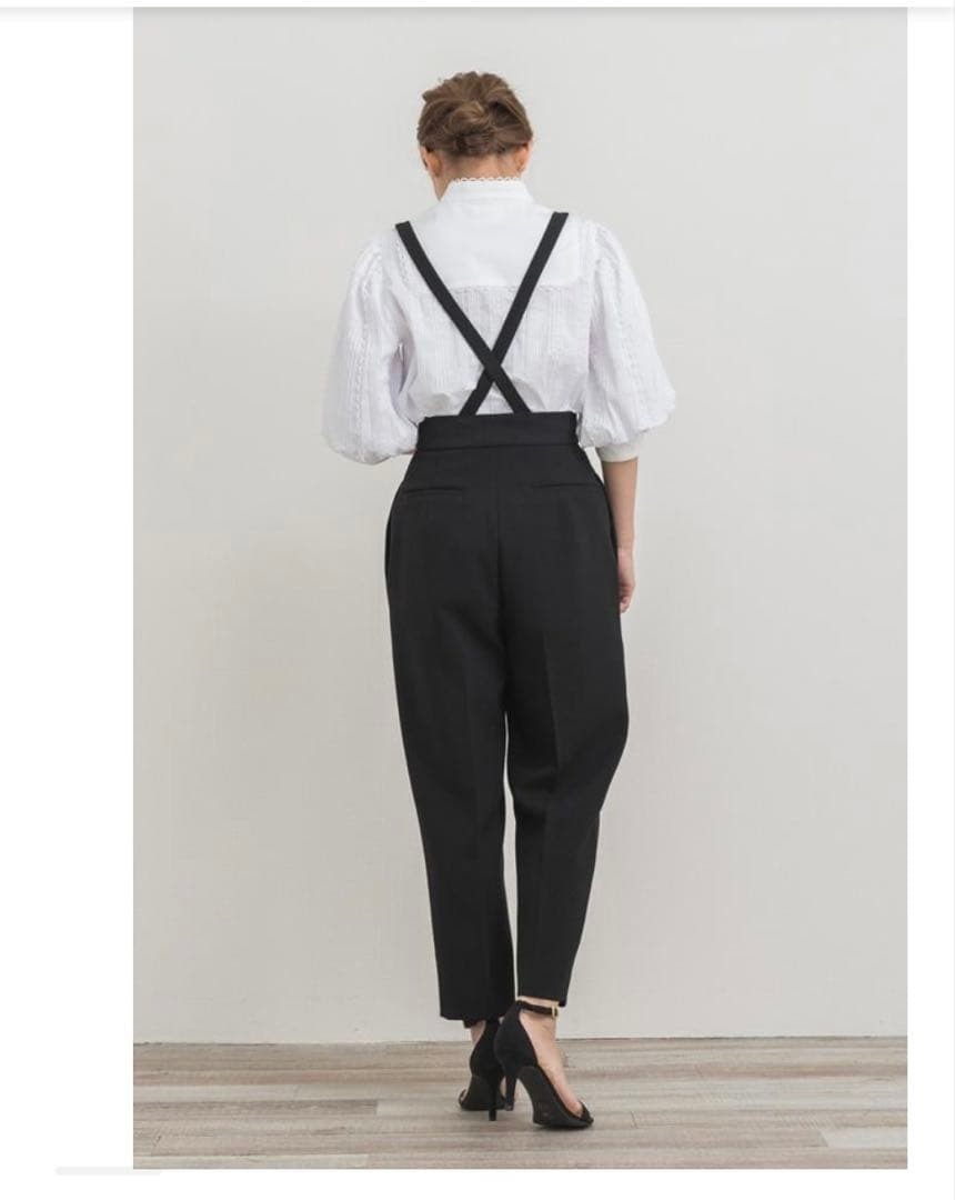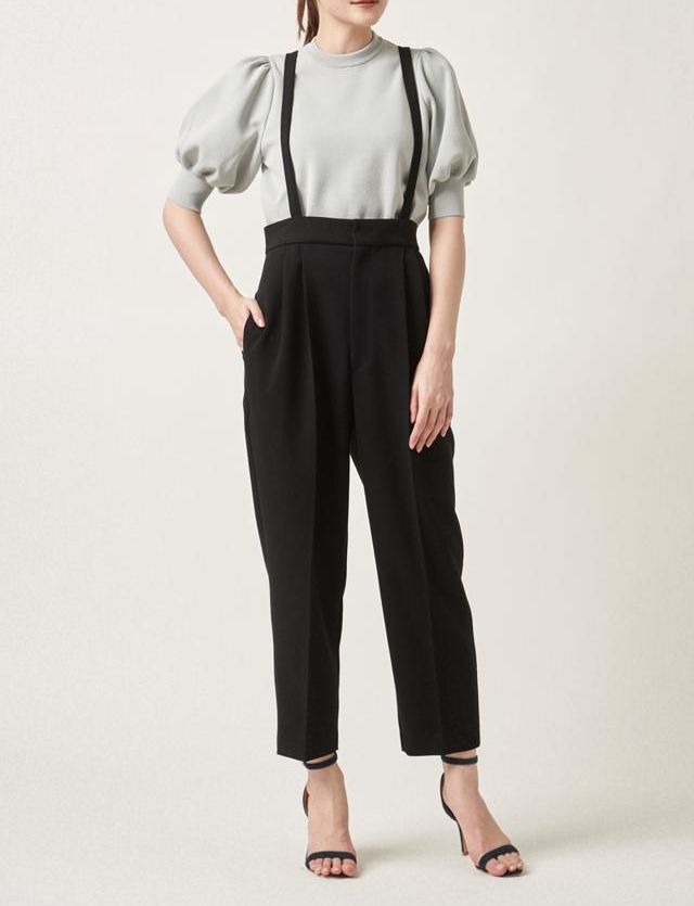 ほど良い膨らみのダブルクロス素材を使用しています。独特の柔らかさと伸縮性に優れ着心地の良さも魅力です。シワになりにくくデイリー使いしやすいです。パンツはハイウエストのデザインと足首にかけて細くなるテーパードラインですっきりとした印象の一着です。フロントに施したタックがほど良いゆとりを生み、ウエストイン・アウトどちらの着こなしも好相性の絶妙なバランスに。サスペンダーは取り外し可能で、シーンに合わせて表情を変えられるのもポイントです。