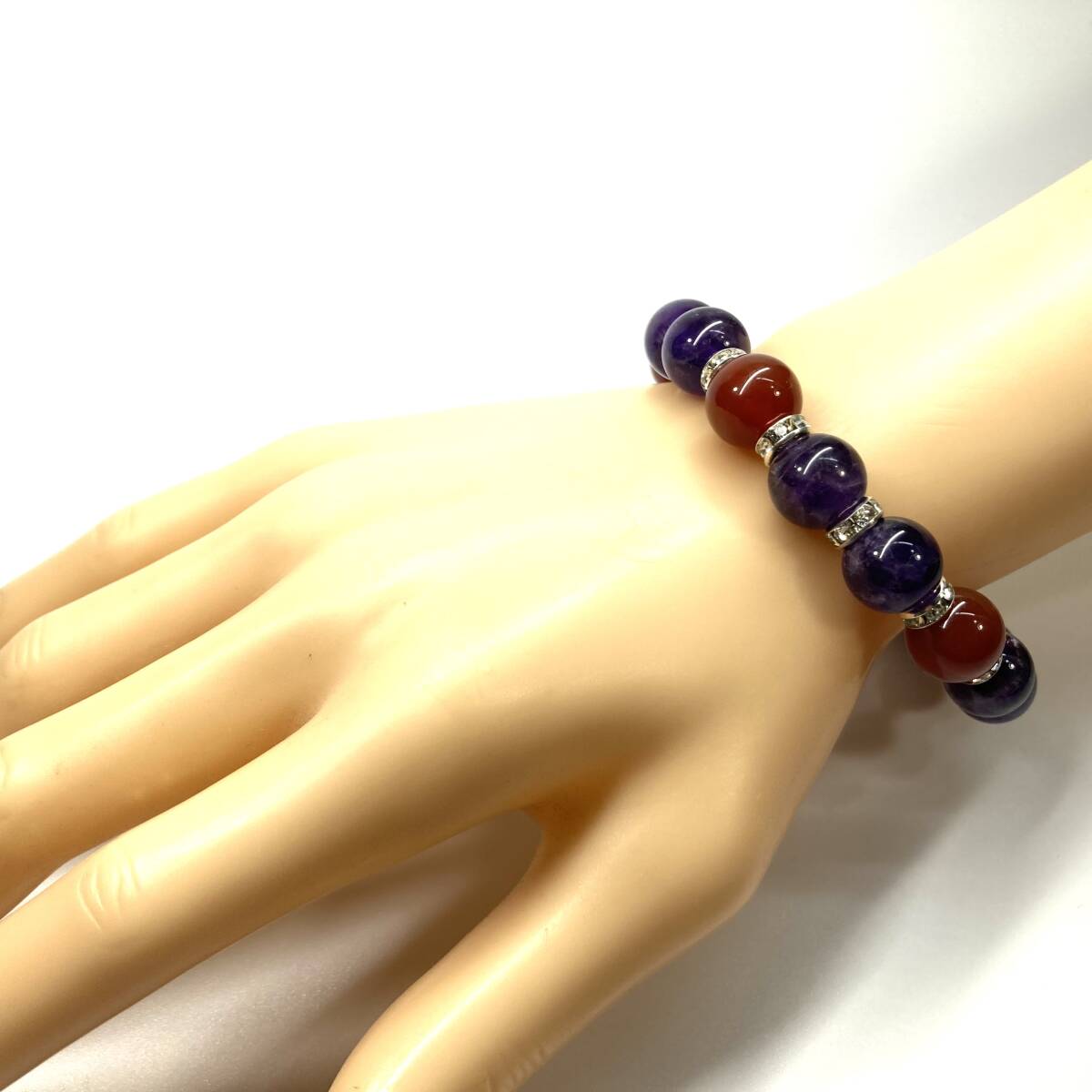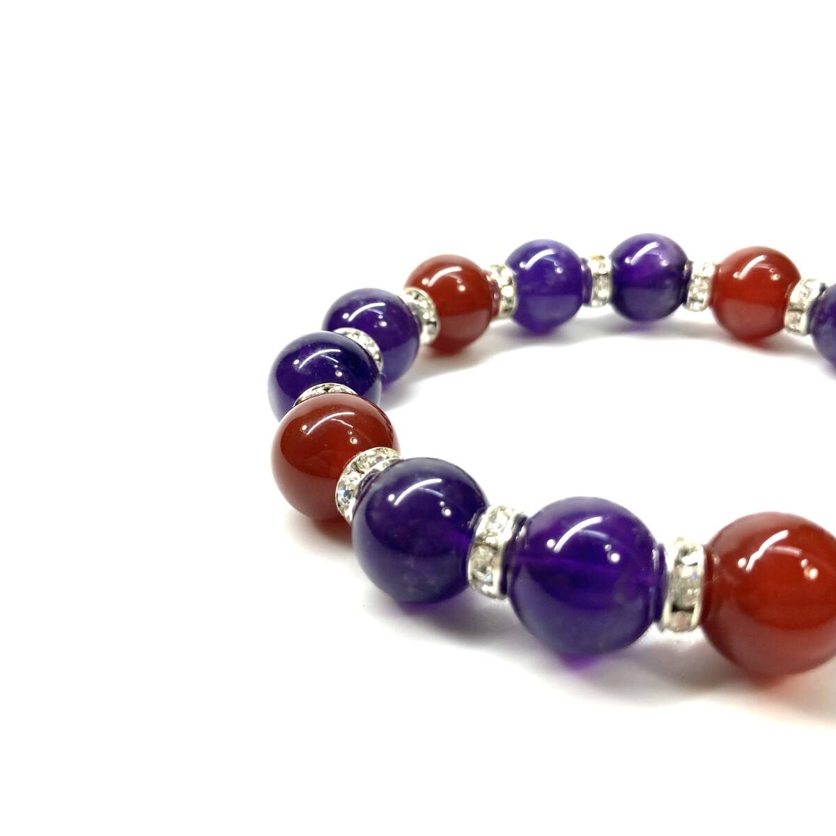 こちらは、赤瑪瑙とアメジストを組み合わせたパワーストーンブレスレットです。間にはロンデルを挟み高級感あるデザインに仕上げております。石大きさは12mm玉を使用して内周約18cmです。気になる方は是非この機会にどうぞ。