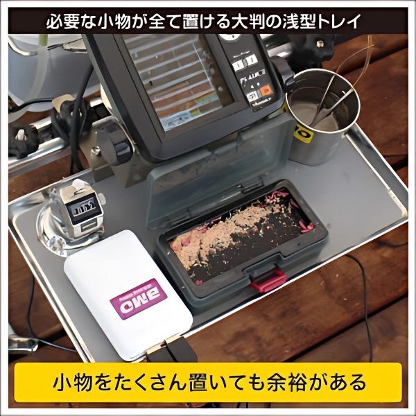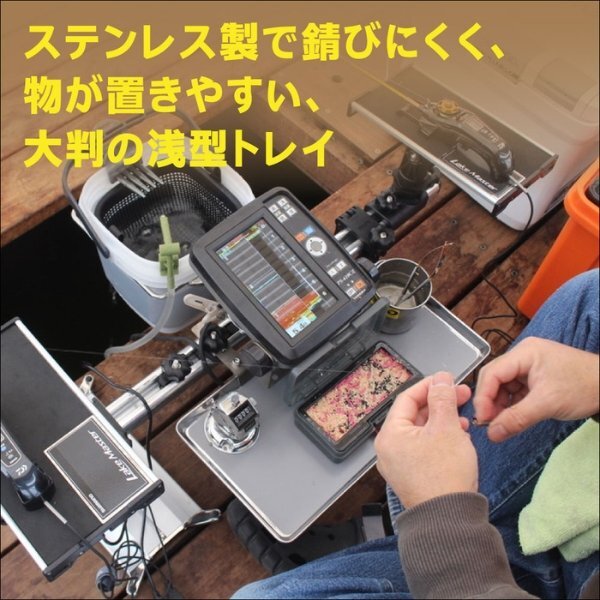 エサ箱やカウンターなど、手元に必要な小物を全て置いてもスペースに余裕があるステンレス製の浅型トレイ