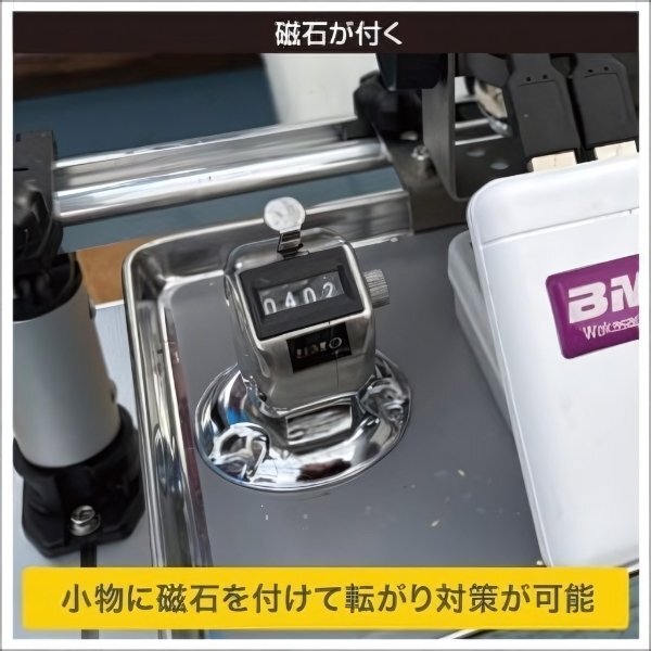 磁石が付くため、小物に磁石をつけて転がり対策が可能